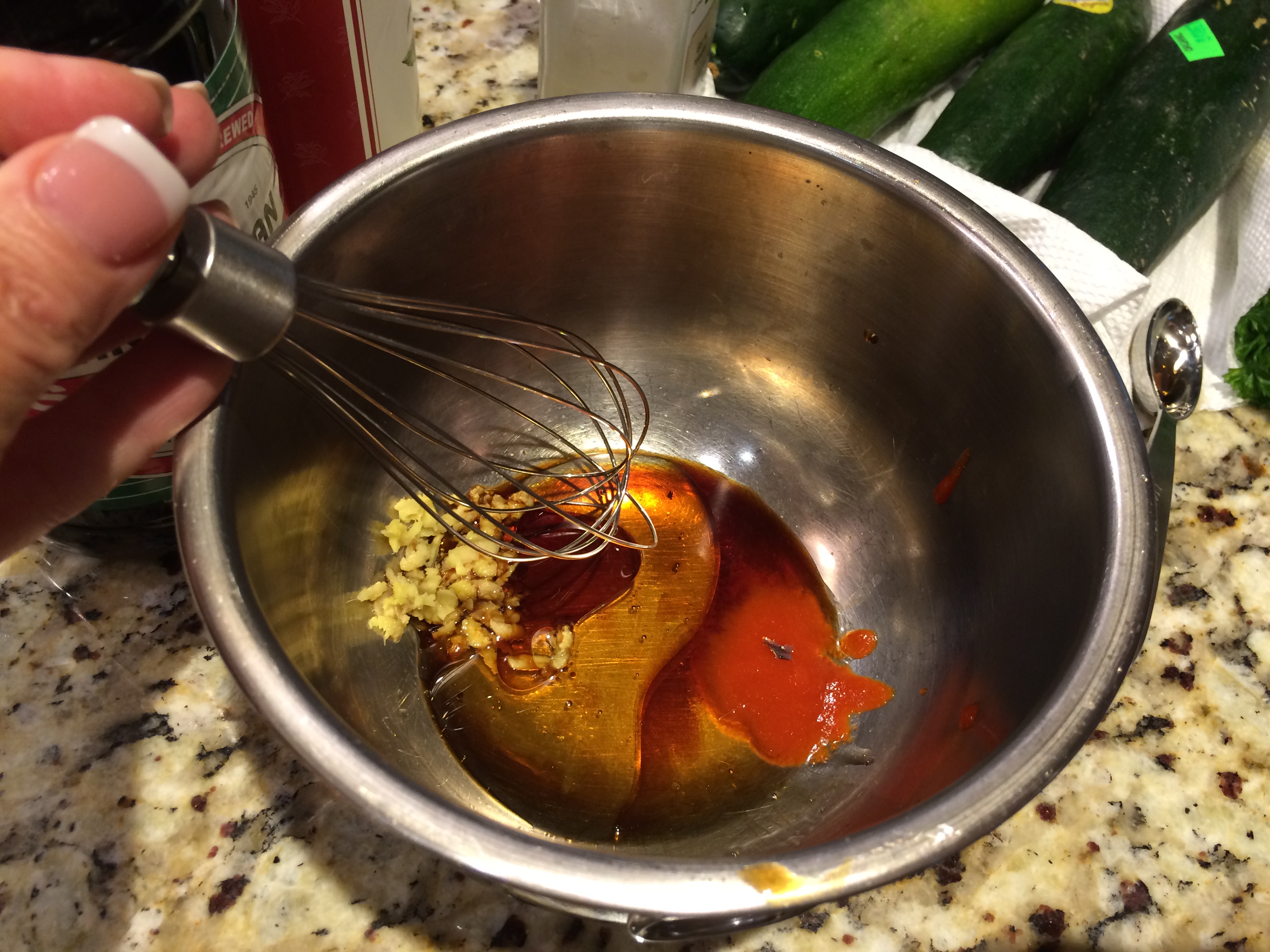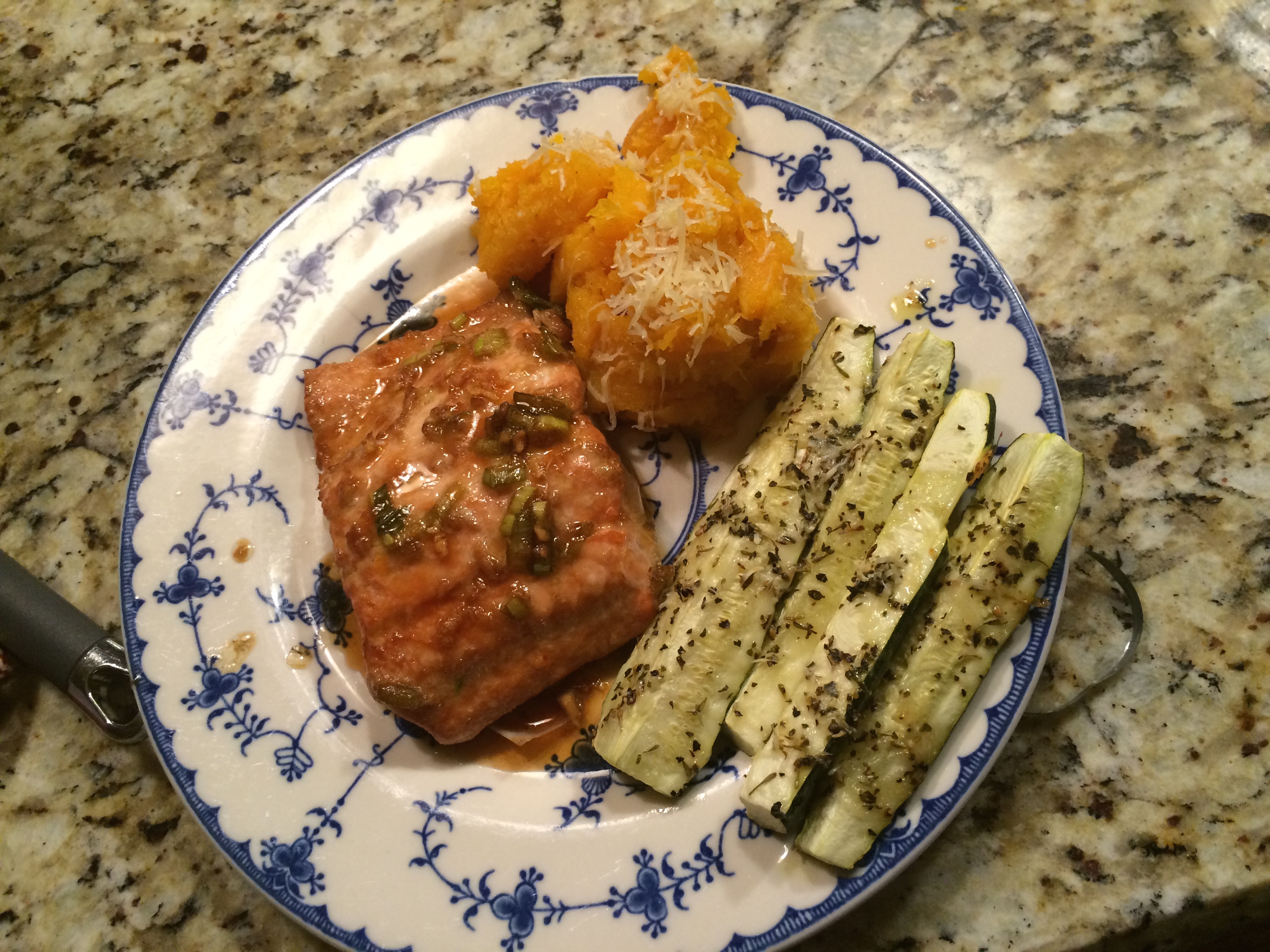 A healthy meal is needed for tonight. I haven’t had salmon in a while, and I love a soy sauce/ginger/garlic glaze on just about anything, so the combination should be delicious! I’m rounding out the meal with some baked zucchini and butternut squash. It’s a light, healthy, colorful and tasty menu!