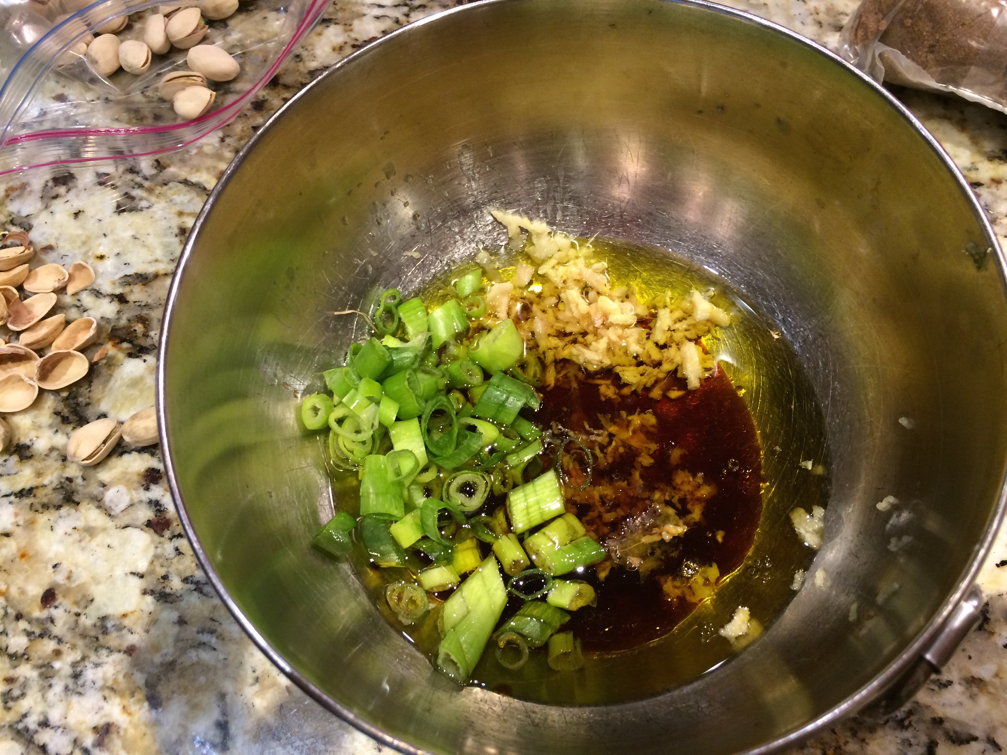 In a medium bowl, whisk together olive oil, soy sauce, rice vinegar, sesame oil, brown sugar, garlic, ginger, and green onions.