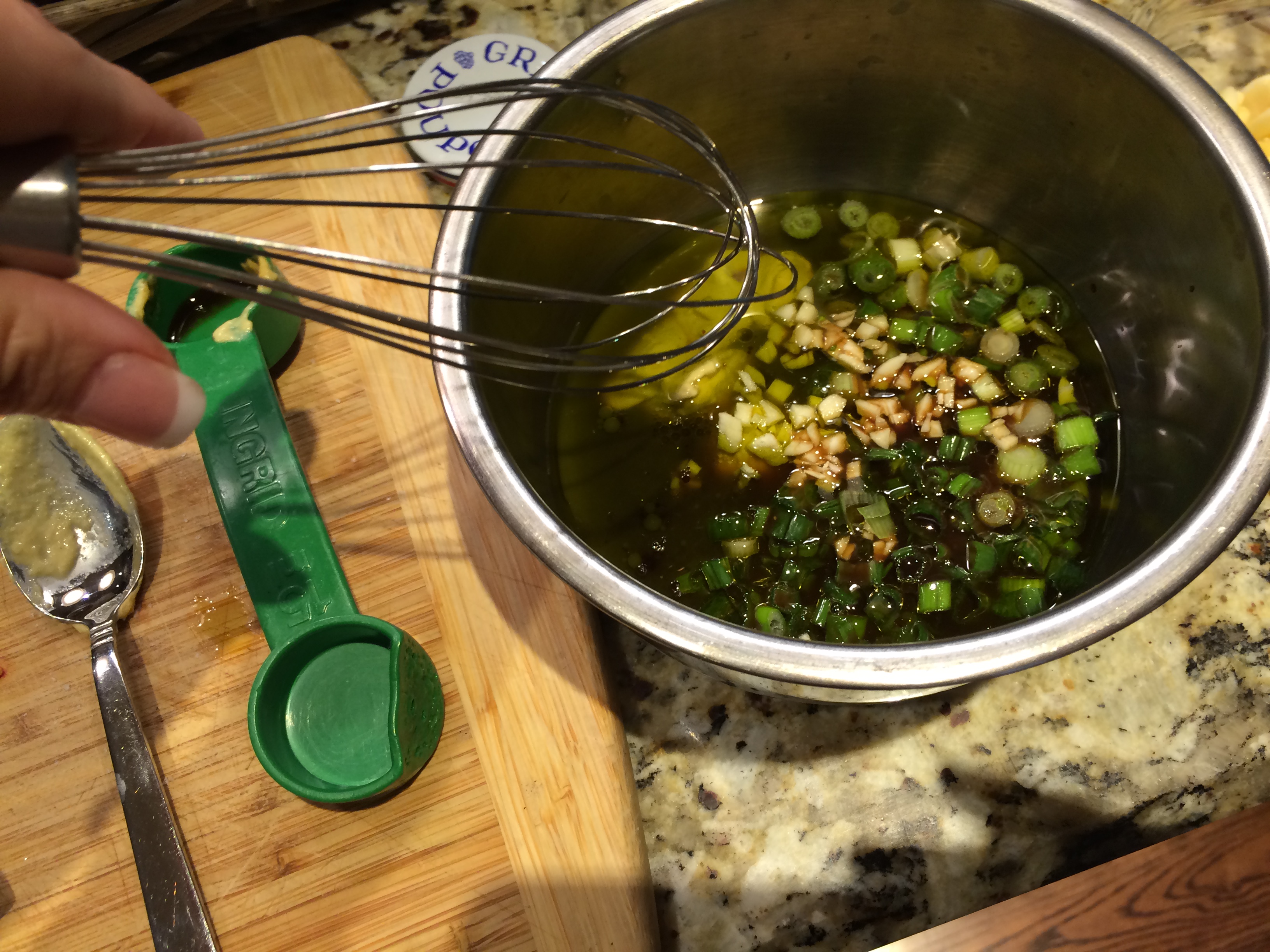 Combine the zest and juice of 2 limes, 3 TBSP Olive Oil, Dijon Mustard, Worcestershire, Soy sauce, 3 green onions, 2 garlic cloves, salt and pepper, and mix well.