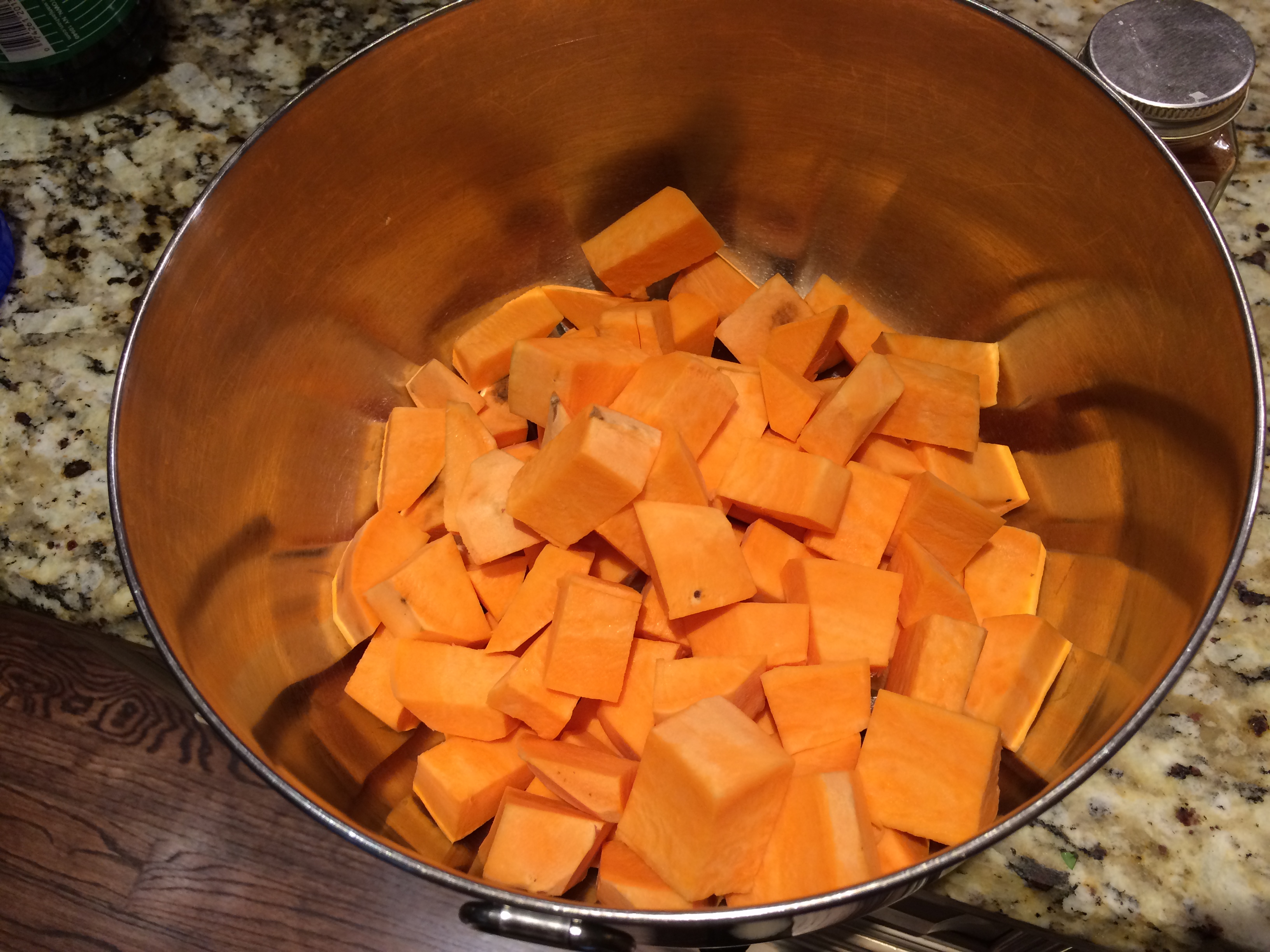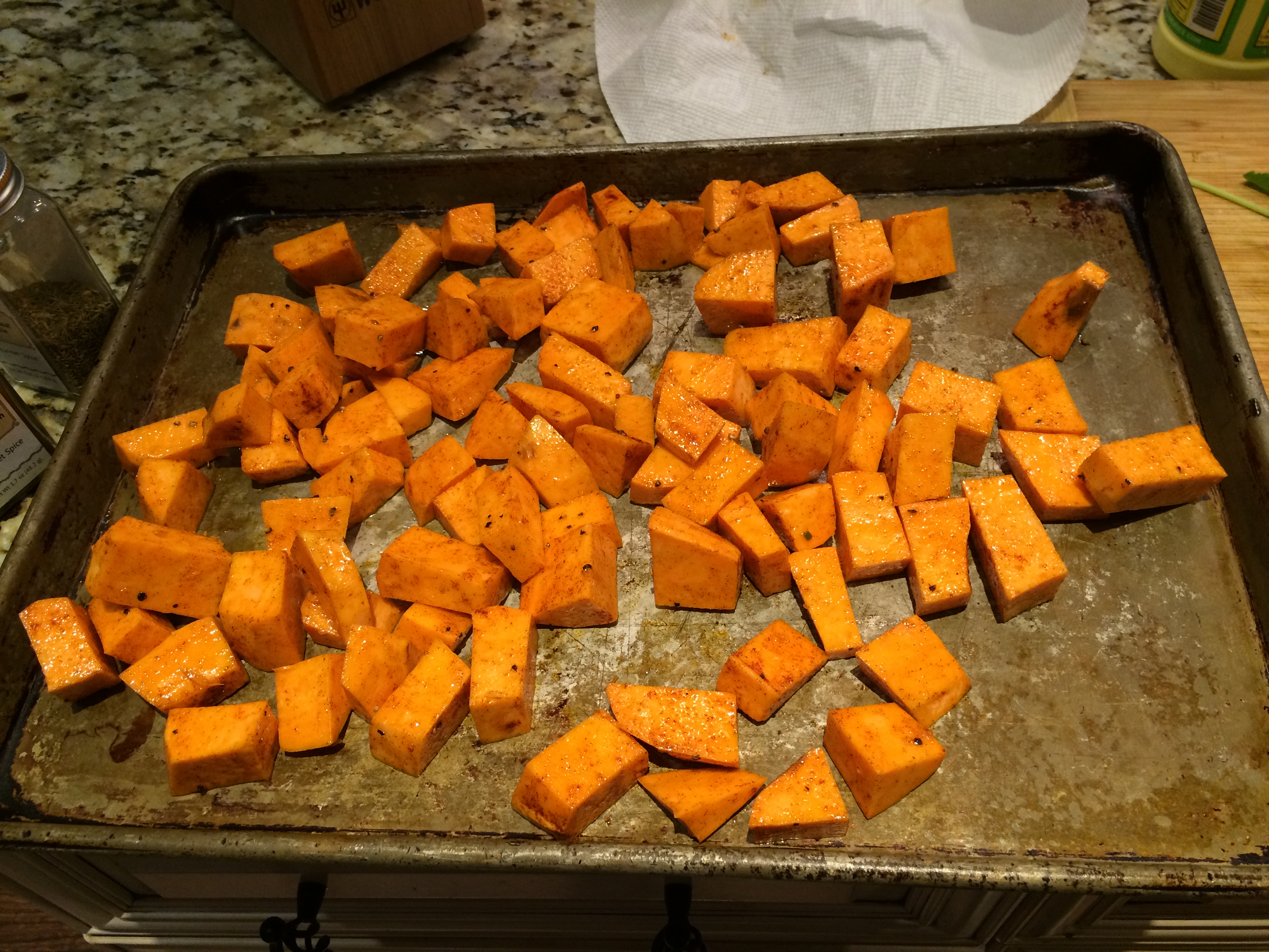 Preheat the oven to 400 degrees F. Peel the sweet potatoes and wash. Then chop the potatoes into approximately 1-inch cubes.
