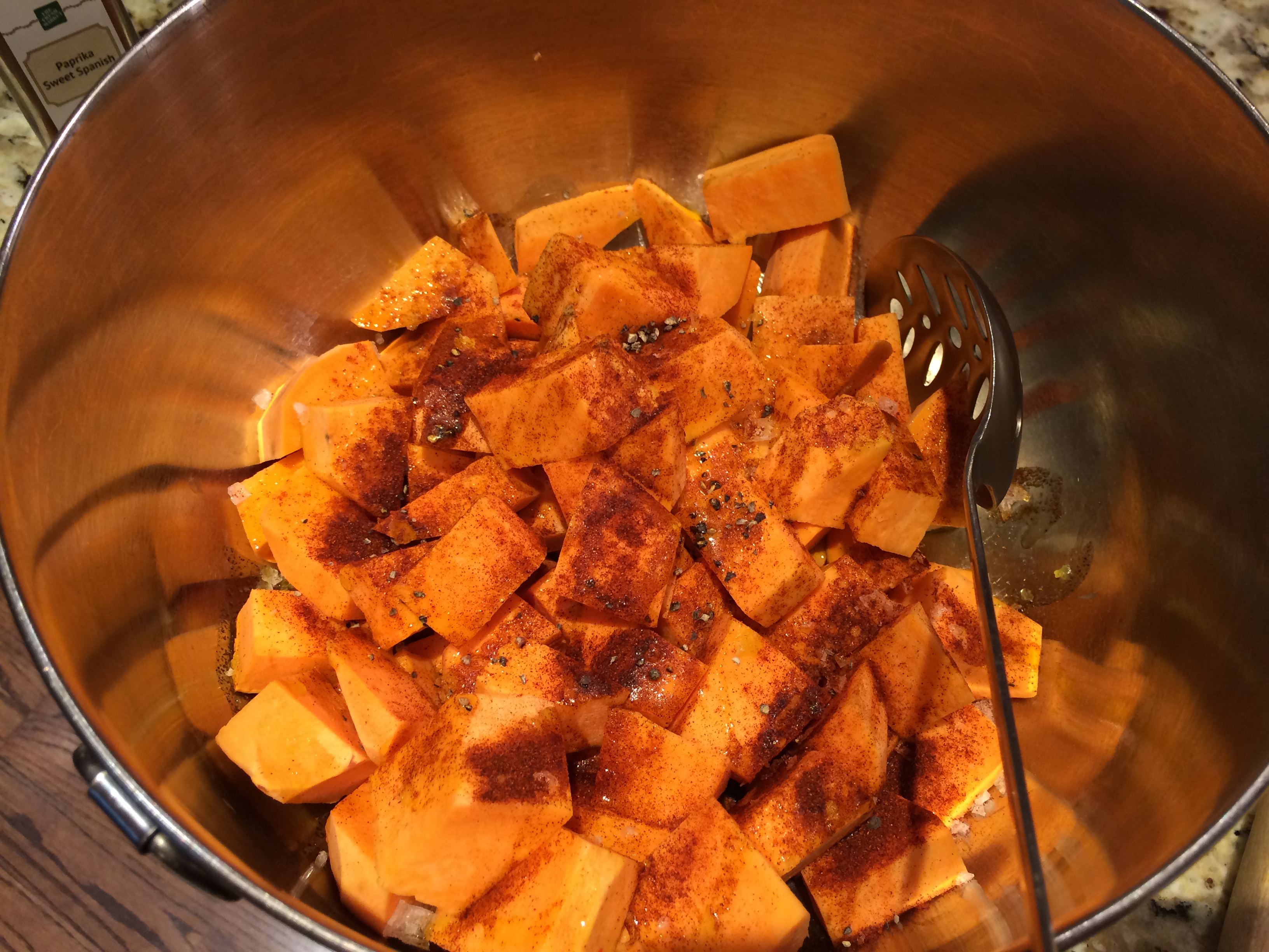 Place in a large bowl and drizzle the olive oil over (maybe 2 TBSP). Then sprinkle about 1 tsp of paprika over and a good amount of salt and pepper. Toss the potatoes and then turn out onto a cookie sheet.