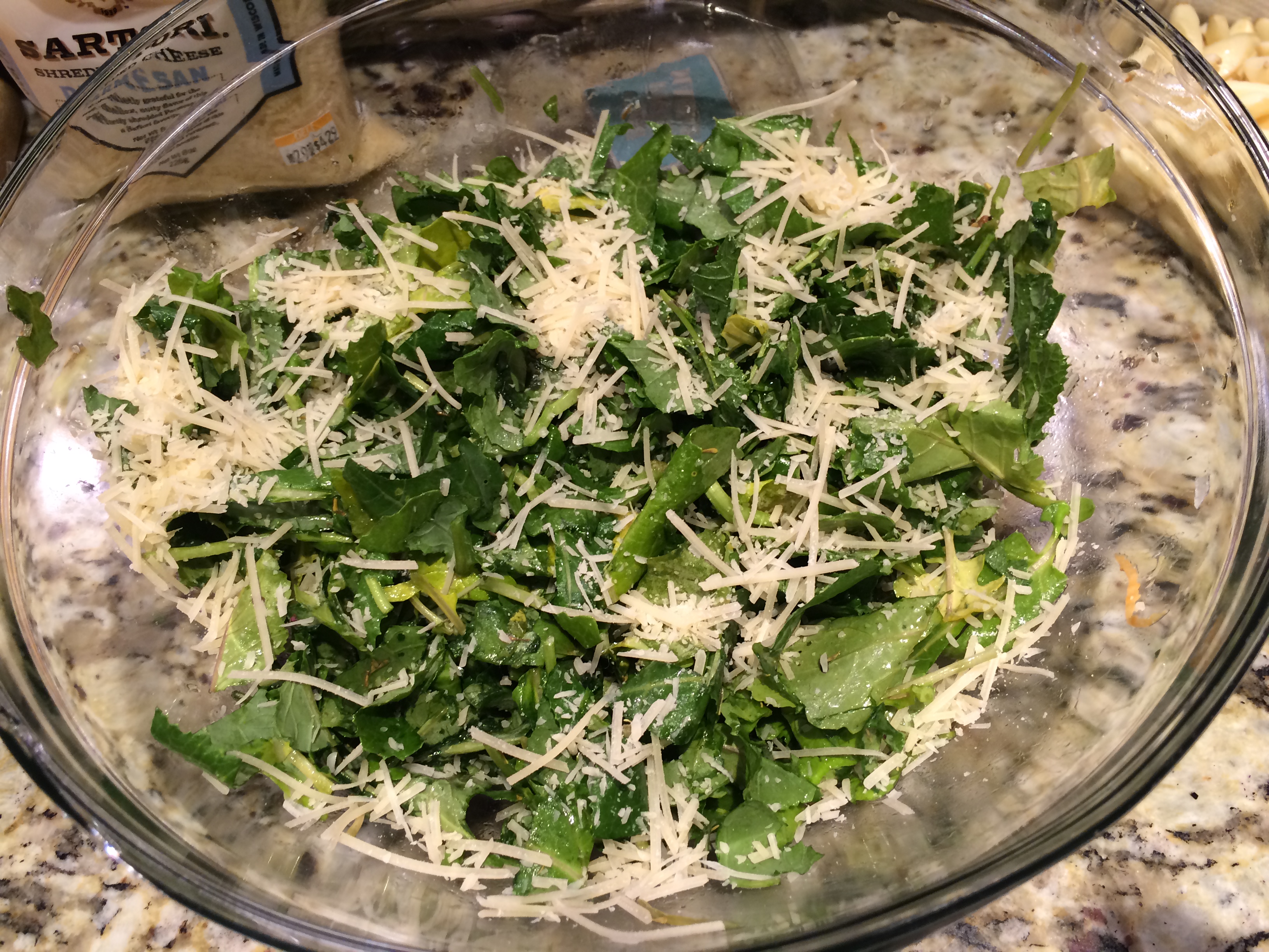 Add kale and Parmesan (and bread crumbs or pine nuts, if using), and toss until the kale is evenly coated.