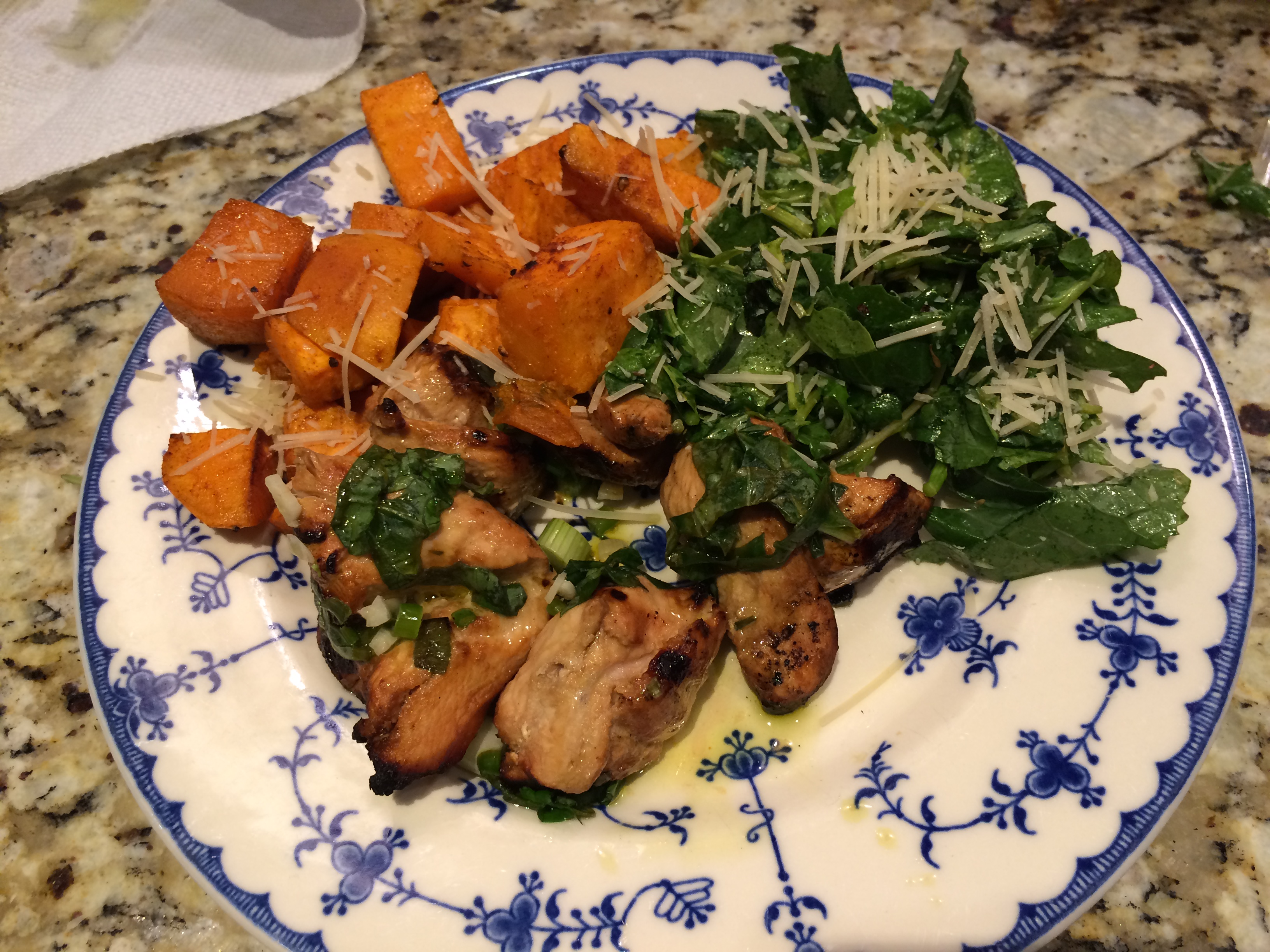 Bake at 400 degrees F for about 20 minutes. Take a look at them after 20 minutes, because it depends on how large or small you chopped the potato pieces as to how long it’ll take to cook. Once they are soft, take out of the oven and serve. Can always sprinkle fresh grated parmesan if you like.