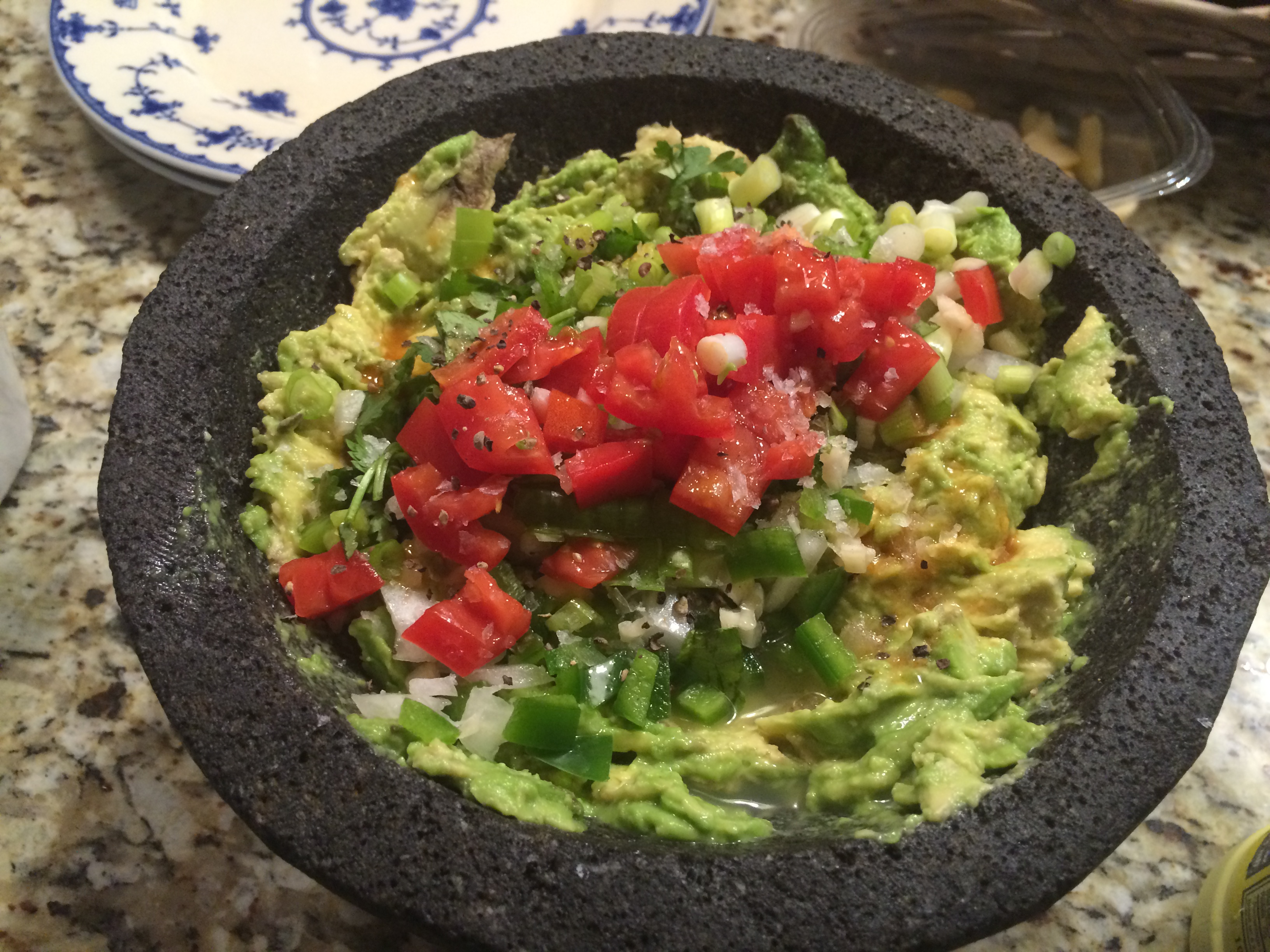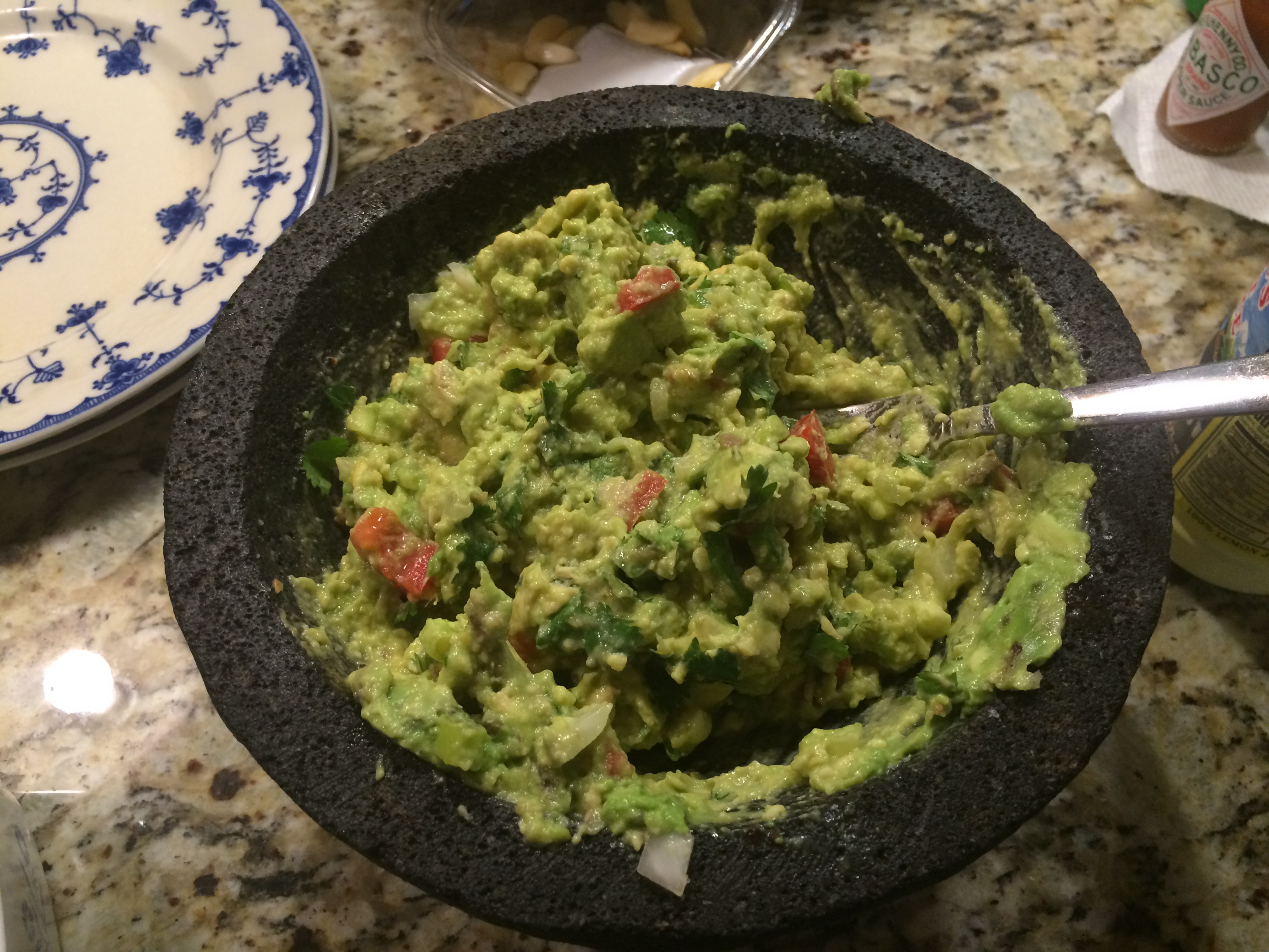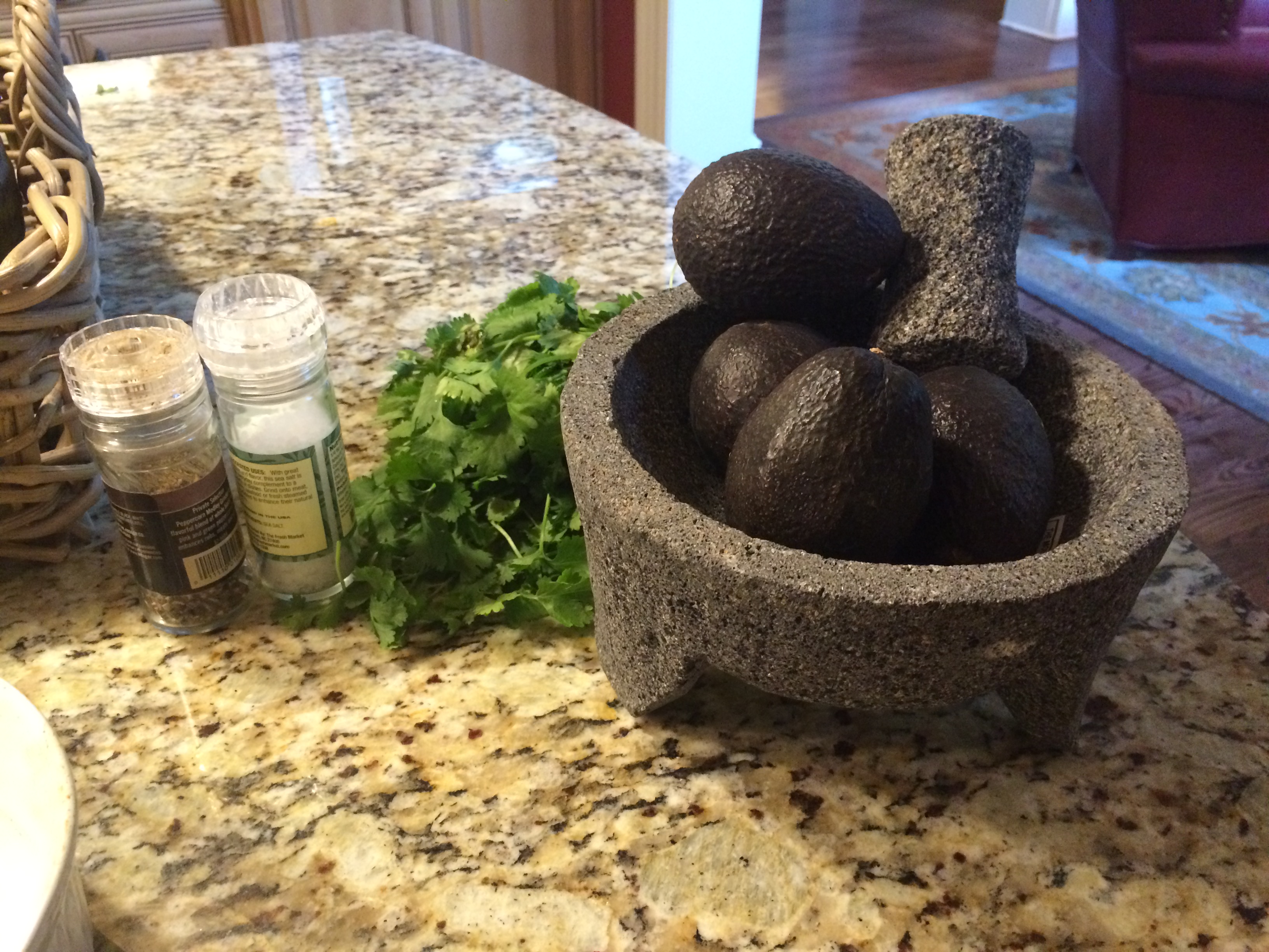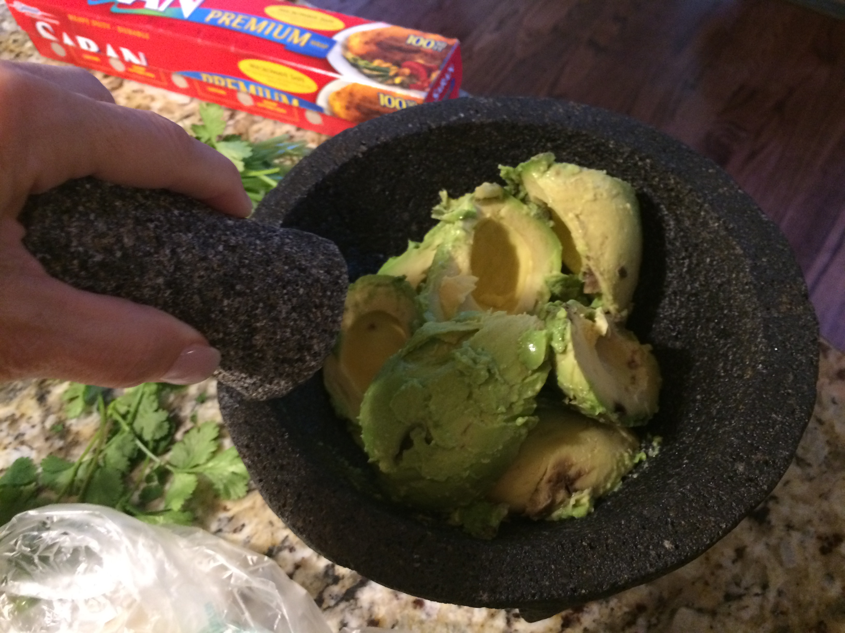 Mash avocados with a fork or potato masher in a bowl, so the consistency is still chunky (rather than baby food consistency). I’m using a gift I got recently from my son to do this chore – a molcajete: