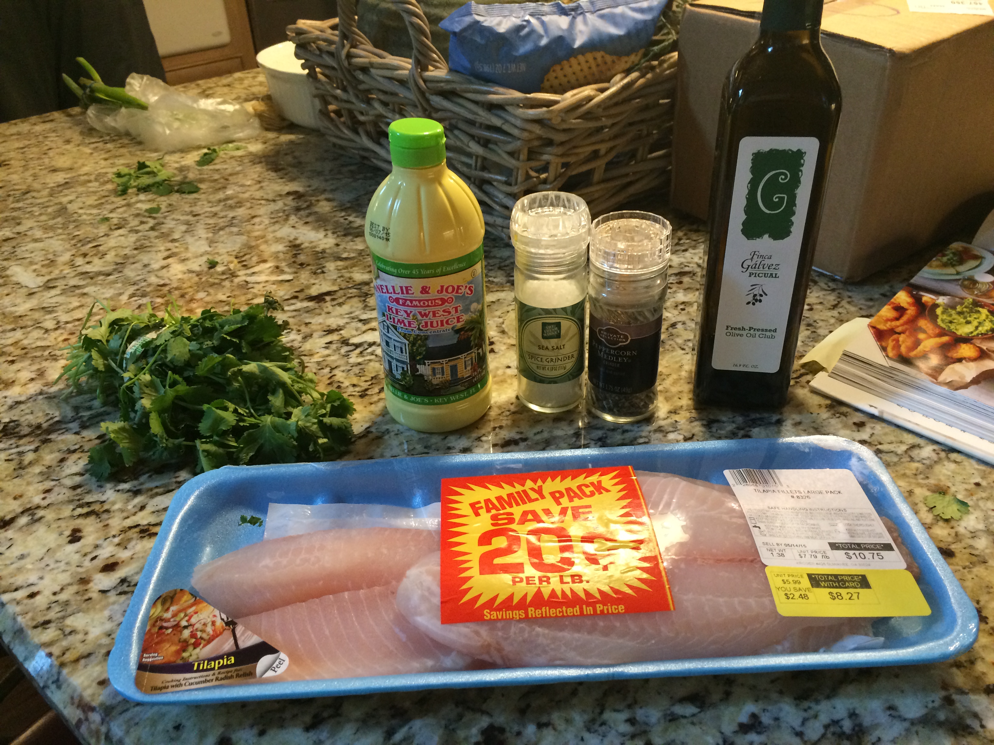 In a dish place the tilapia filets and top with about 2 TBSP olive oil and 2 TBSP lime juice. Season with salt and pepper and sprinkle the chopped cilantro on top.