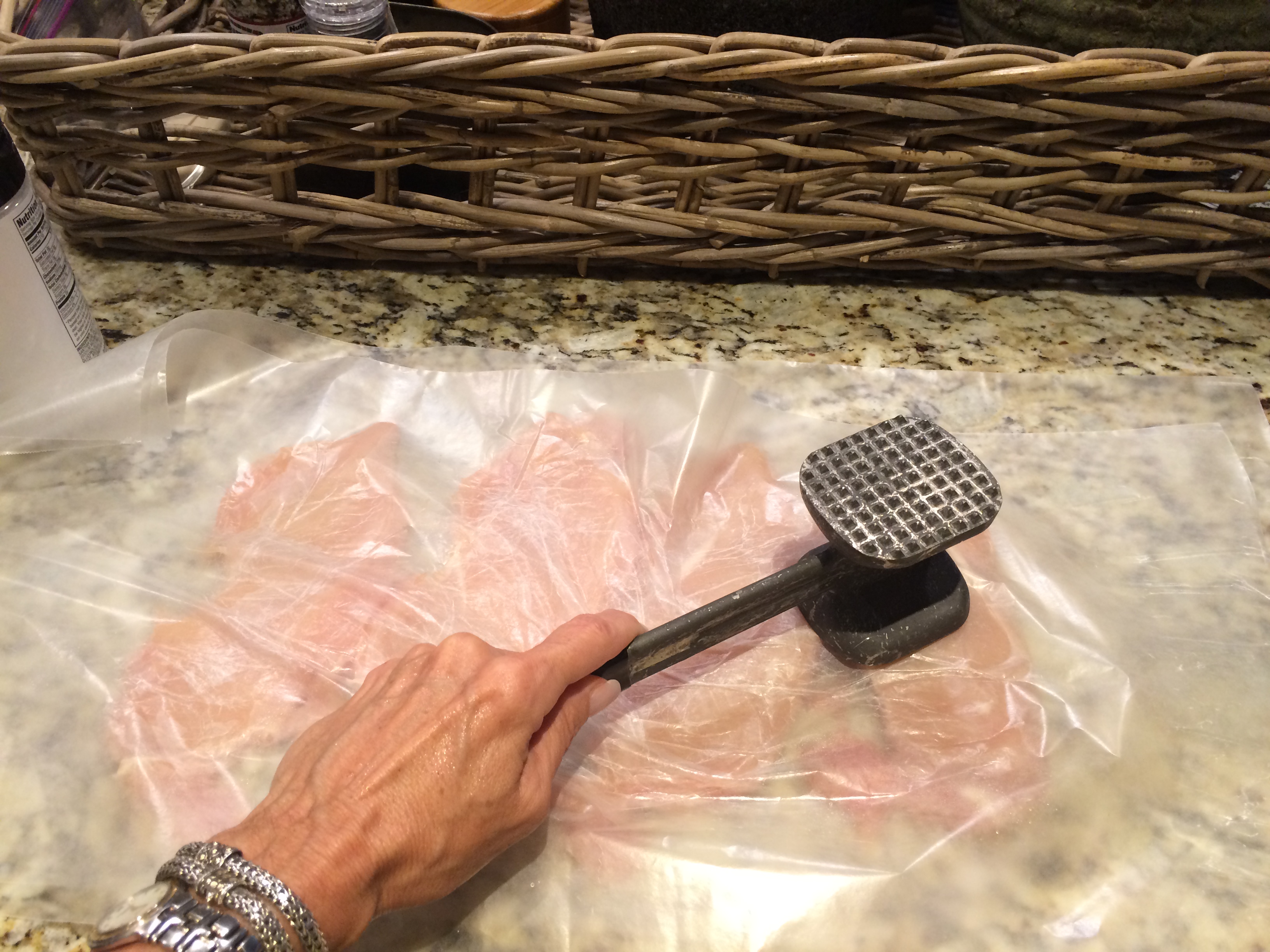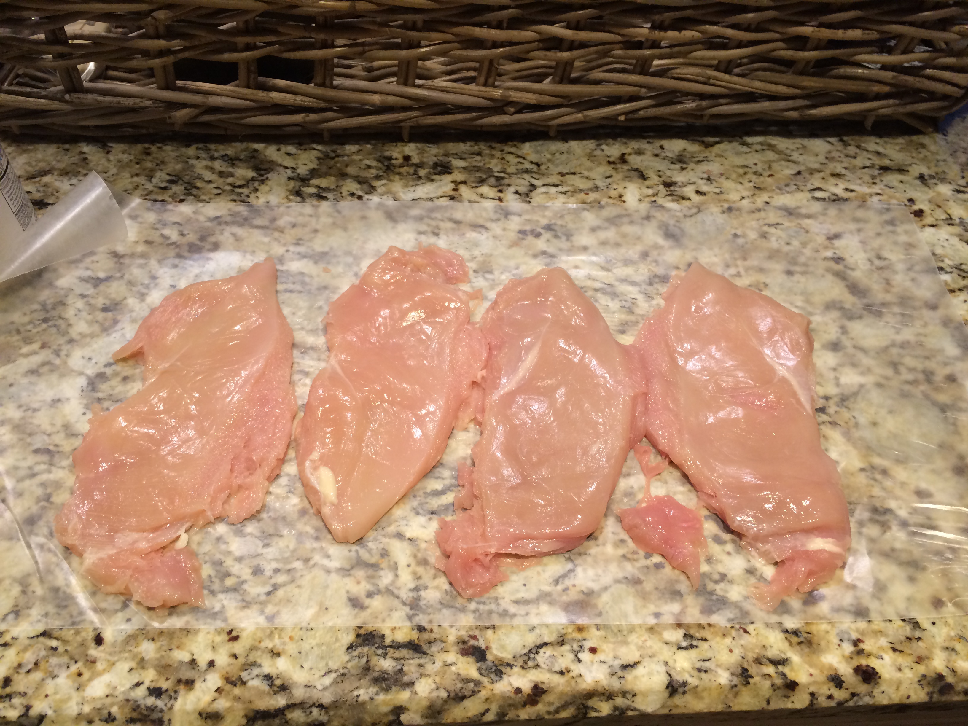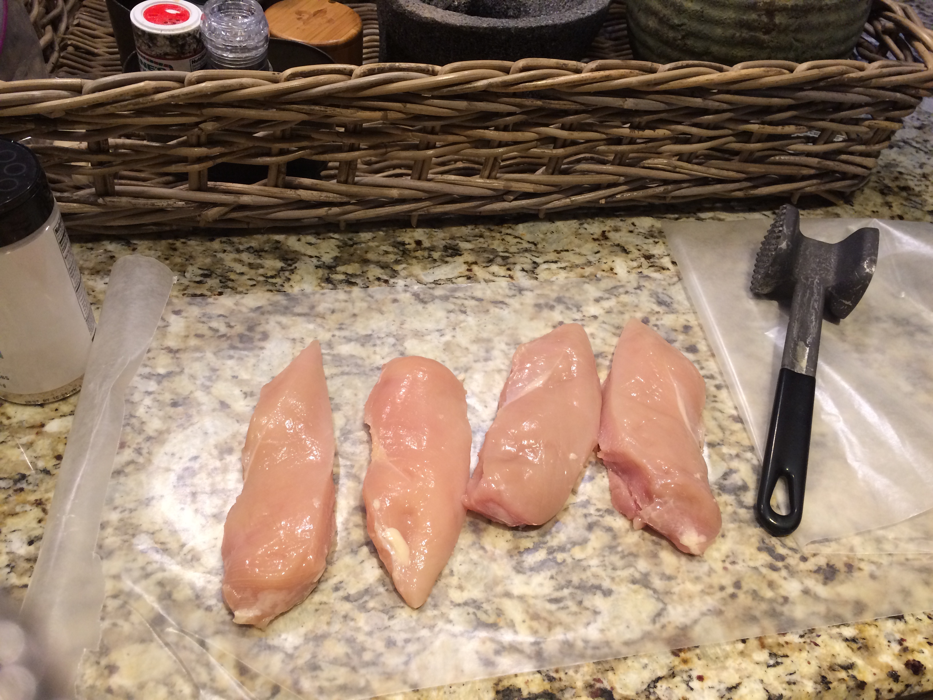 Preheat oven to 350 degrees F. Flatten the chicken to 1/4-inch thickness.