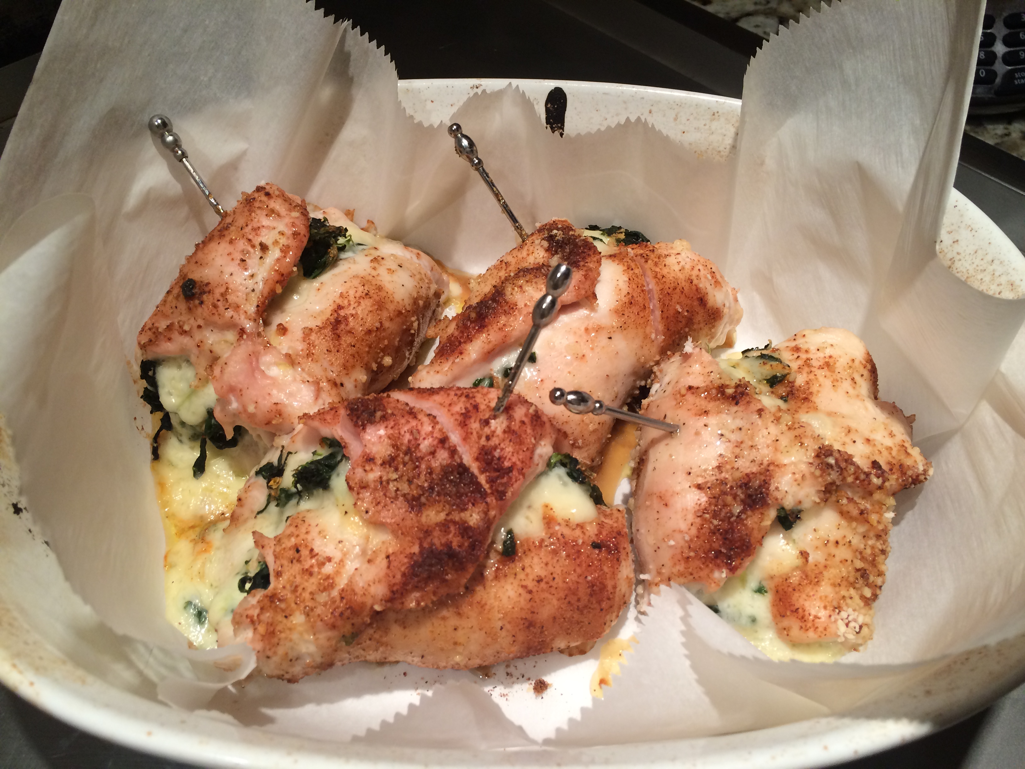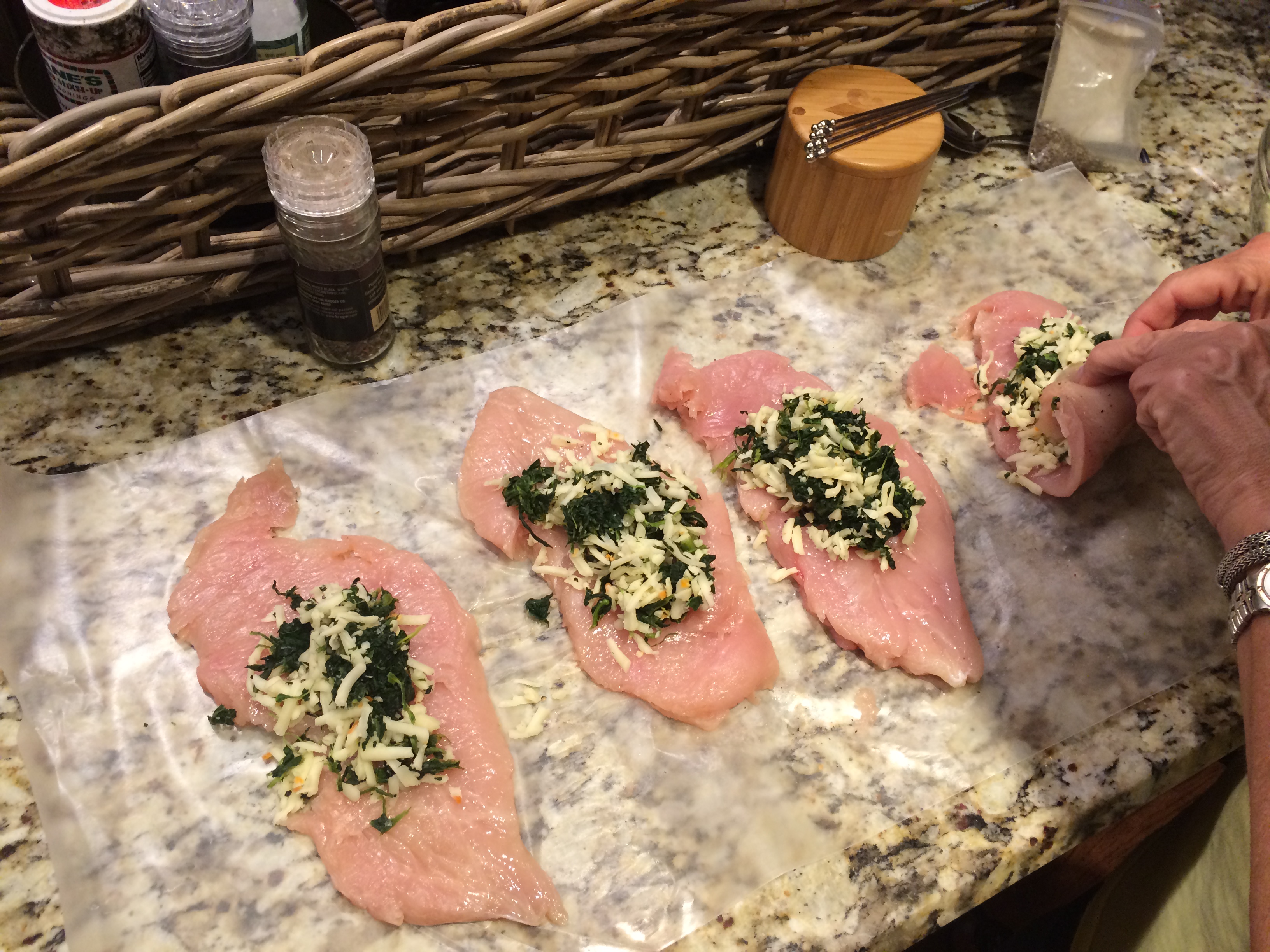 Spoon about 1/4 c of the spinach mixture onto each chicken breast.