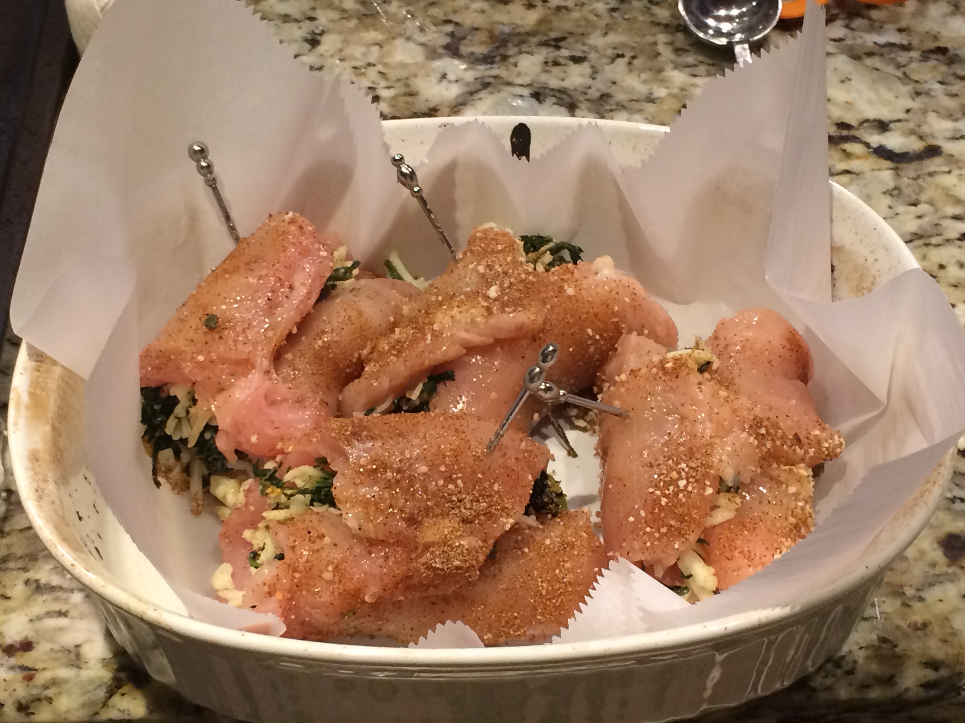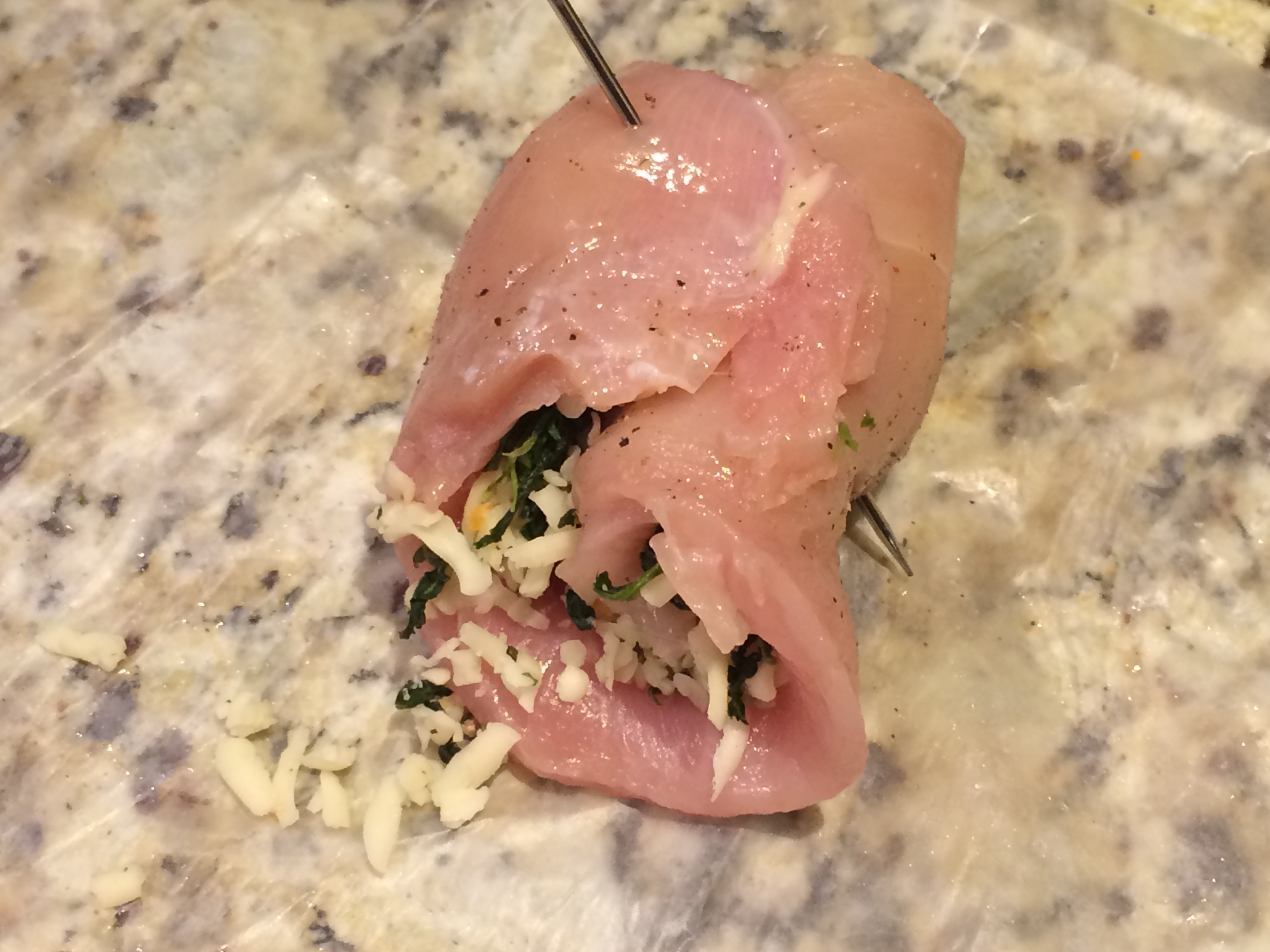 Roll each chicken breast tightly and fasten the seams with several toothpicks or 1-2 metal picks. This part requires a tiny bit of skill. Be patient – and if some of the filling leaks out, it’s OK!