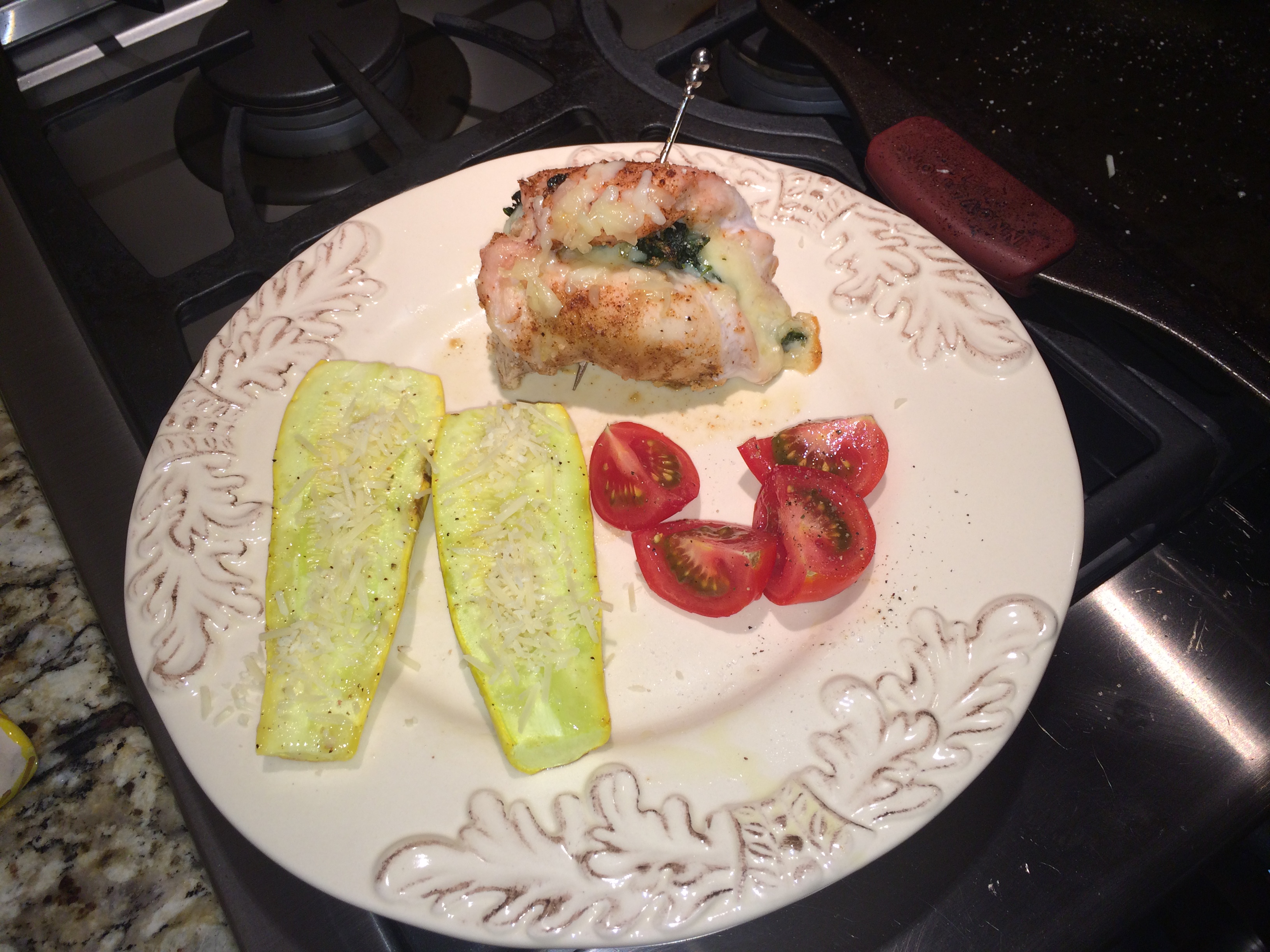 This dish is so yummy! I used habenero monterey jack for the cheese and loved the kick! The spiciness of the habanero is offset nicely with the spinach and the benign summer squash. Add some sliced tomatoes and you’ve got dinner!