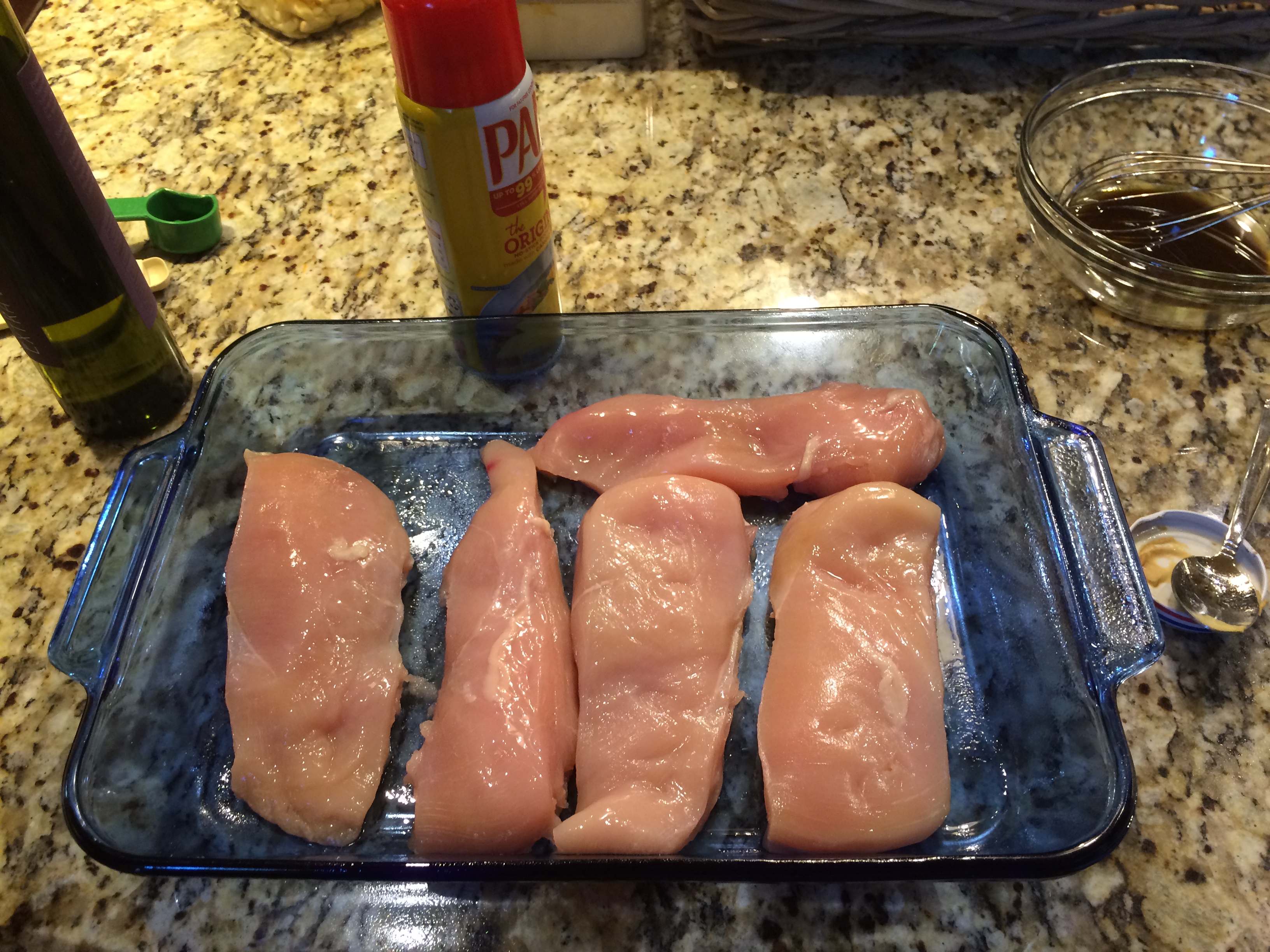 Preheat oven to 350 degrees F. Spray PAM over a glass baking dish. Place chicken breasts in dish and sprinkle with salt and pepper on both sides.
