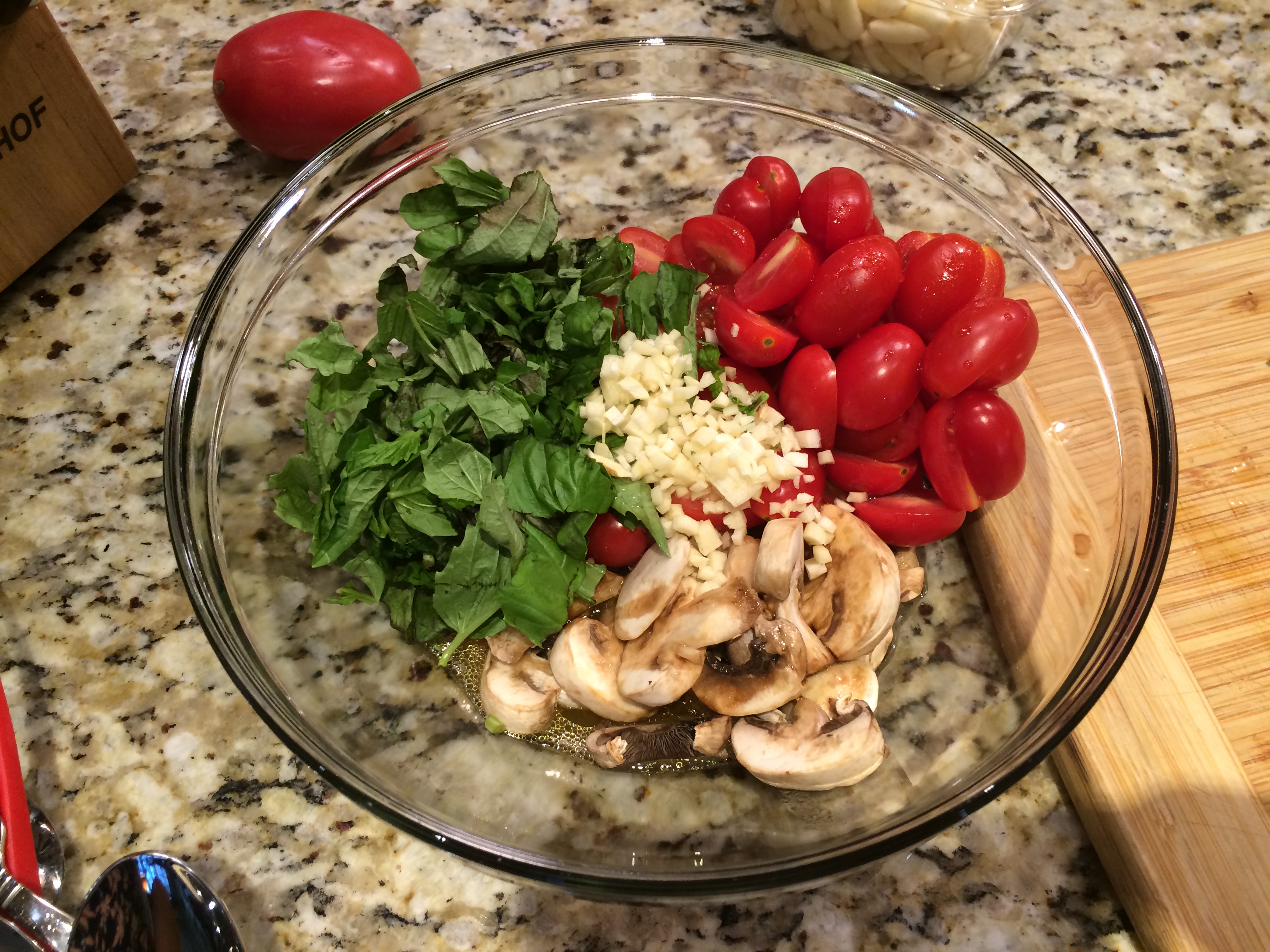 In a bowl, combine garlic, basil, olive oil, Balsamic dressing, mushrooms and cherry tomatoes.