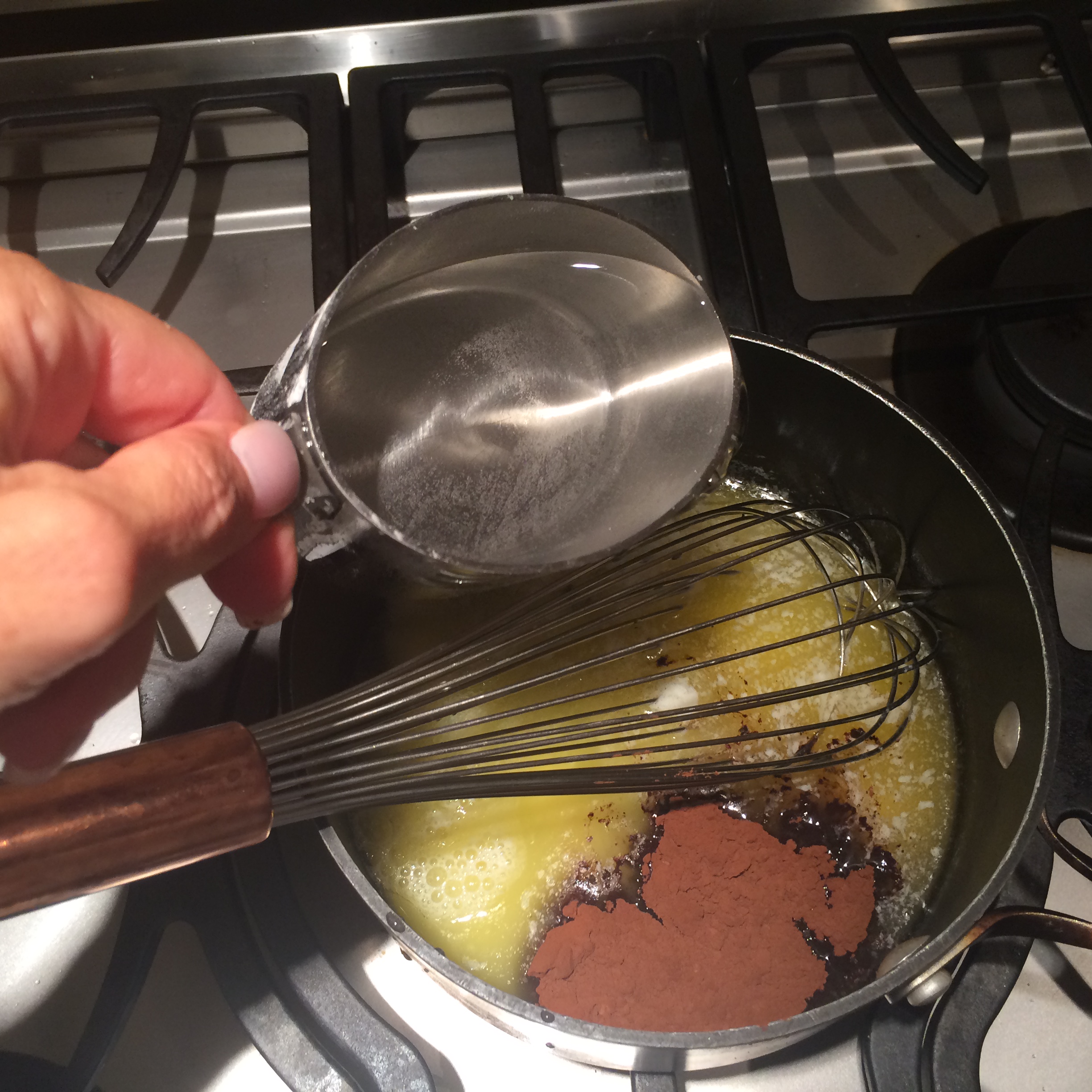 Set aside. In a small sauce pan, melt the butter on medium-low heat. Whisk in the cocoa powder and hot water.