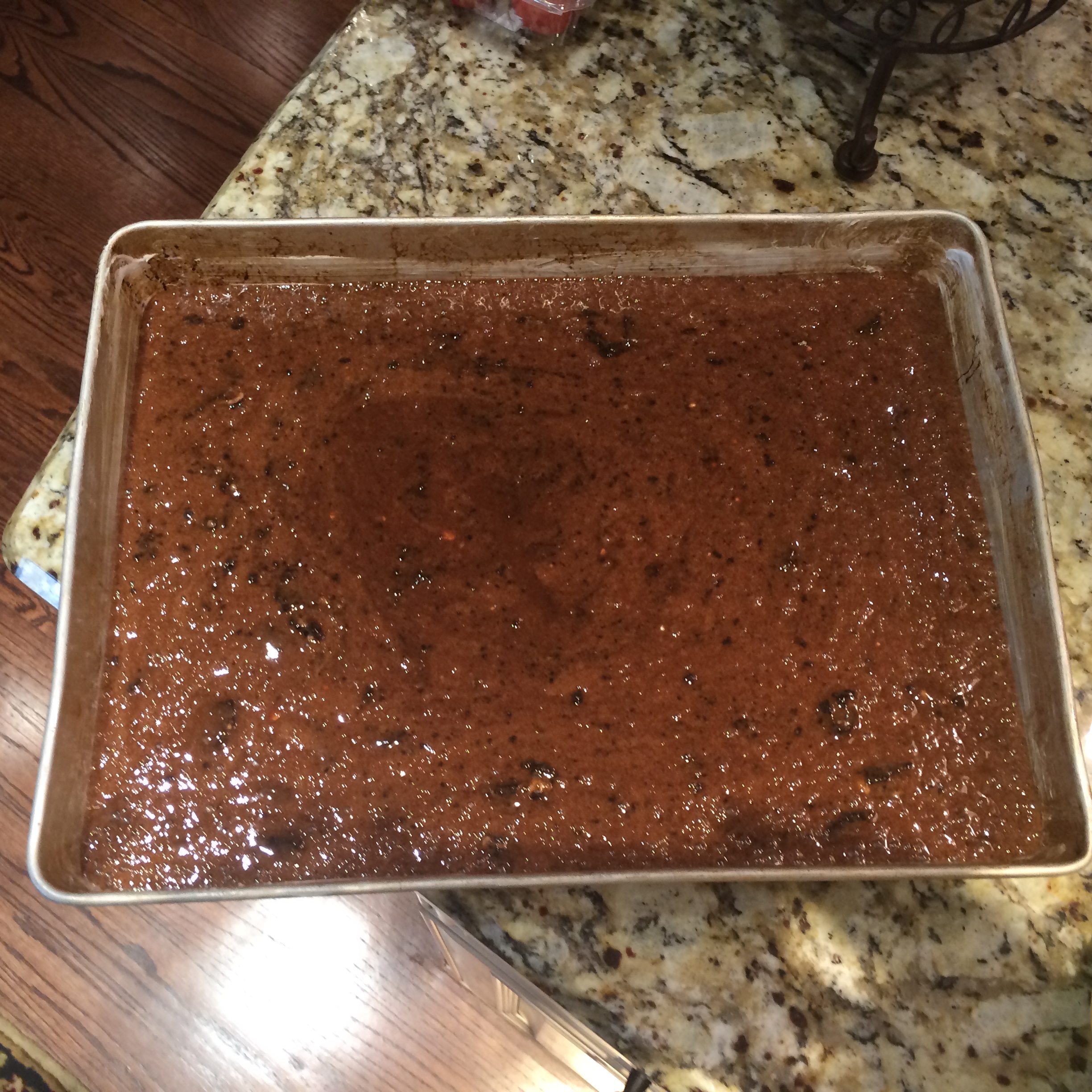 Pour the batter into the prepared sheet pan and tap on the counter a few times to distribute the cake batter evenly.