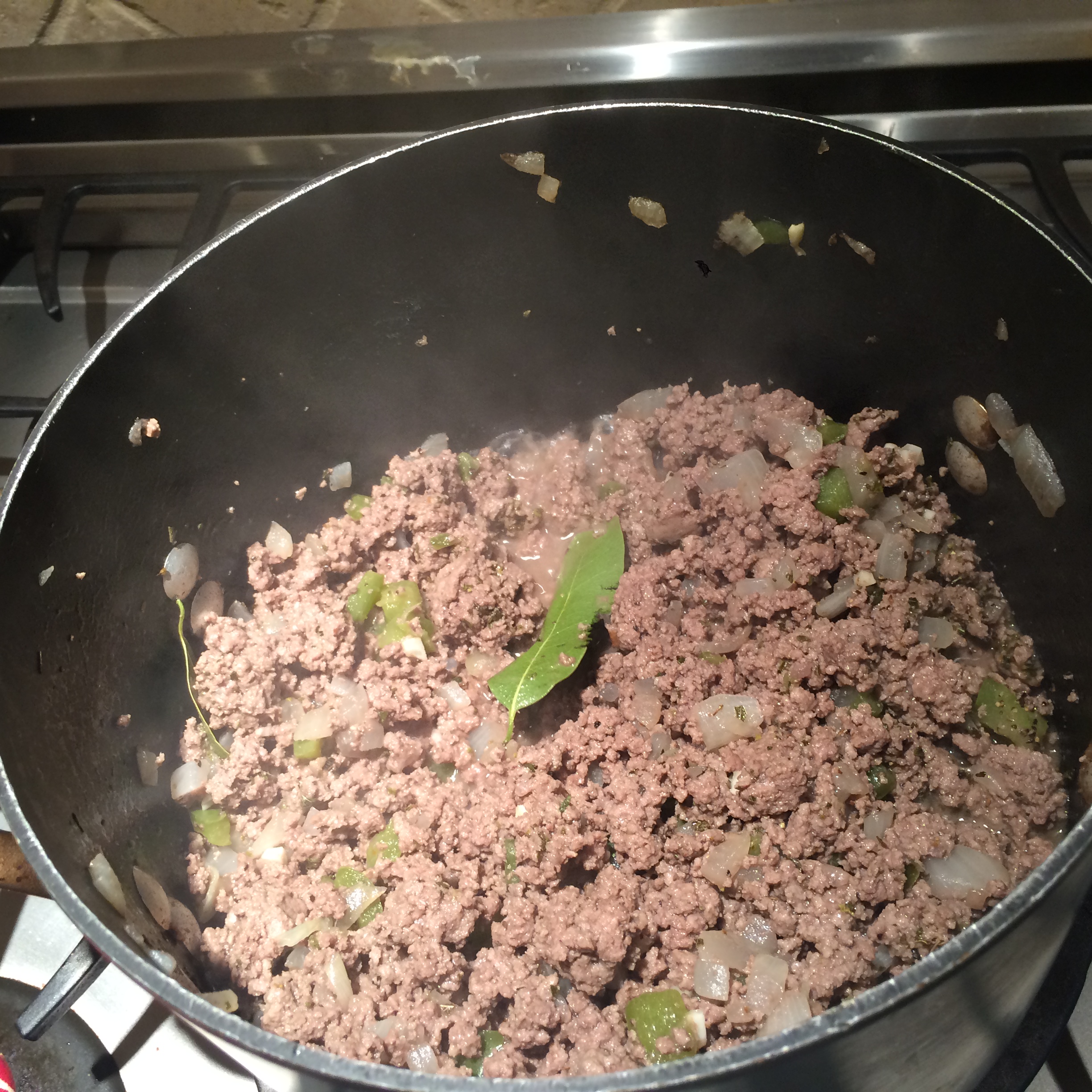 Add salt, oregano, cumin, pepper, and bay leaves. Stir until combined. Add Vino Seco and allow it to cook for 2-3 minutes.