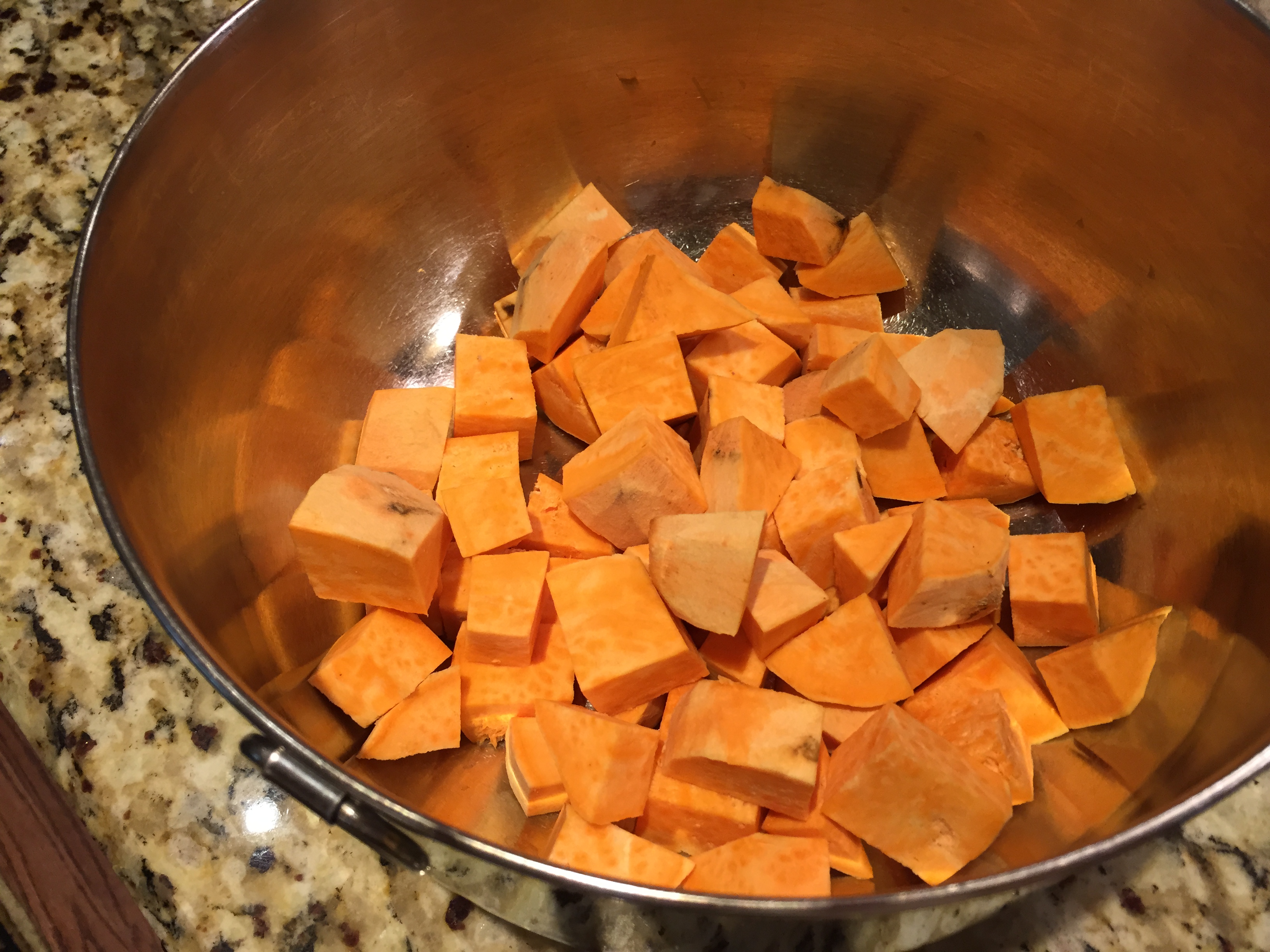 Then dice them into 1 inch chunks, and place the cubes in a large bowl.
