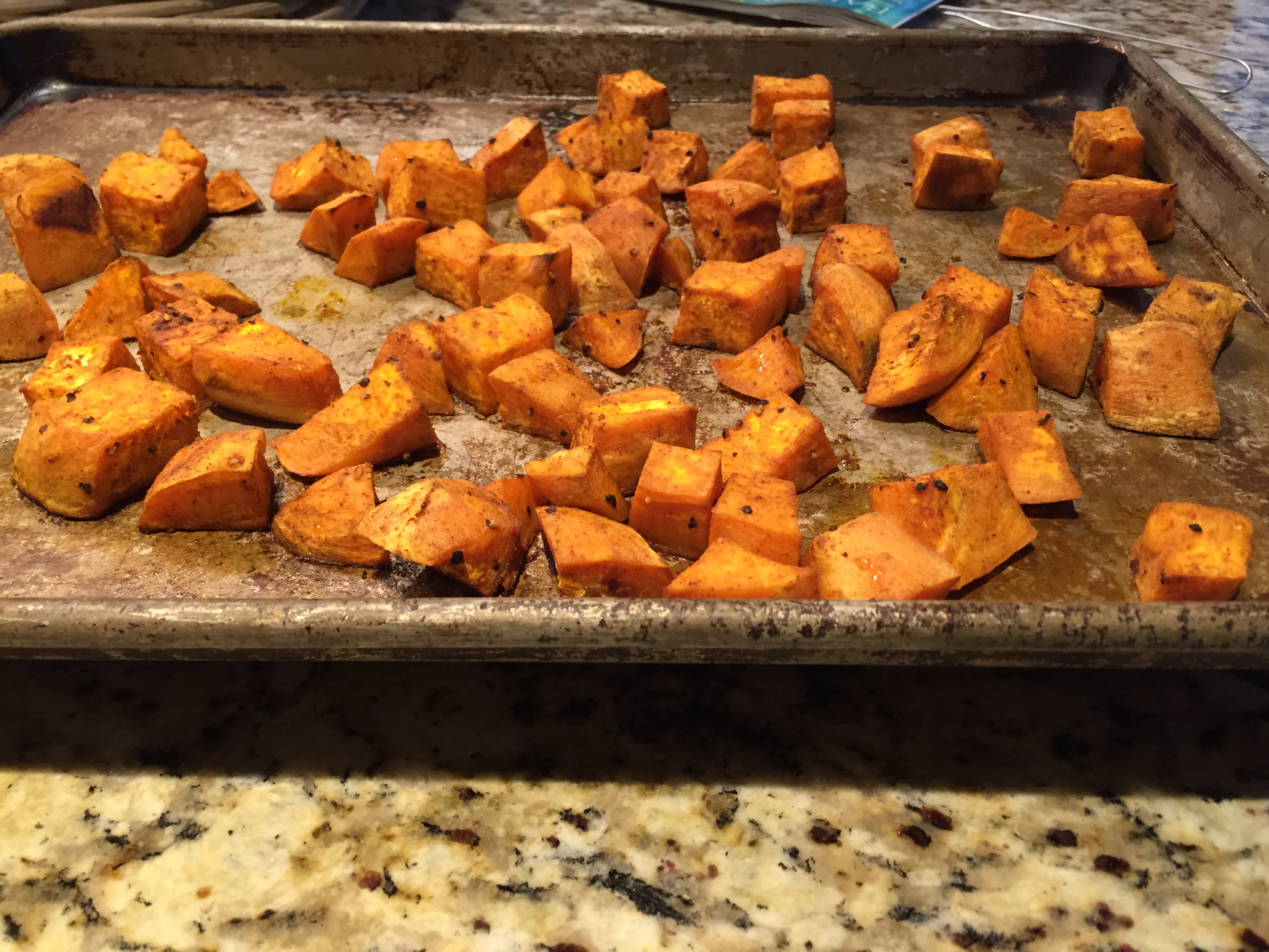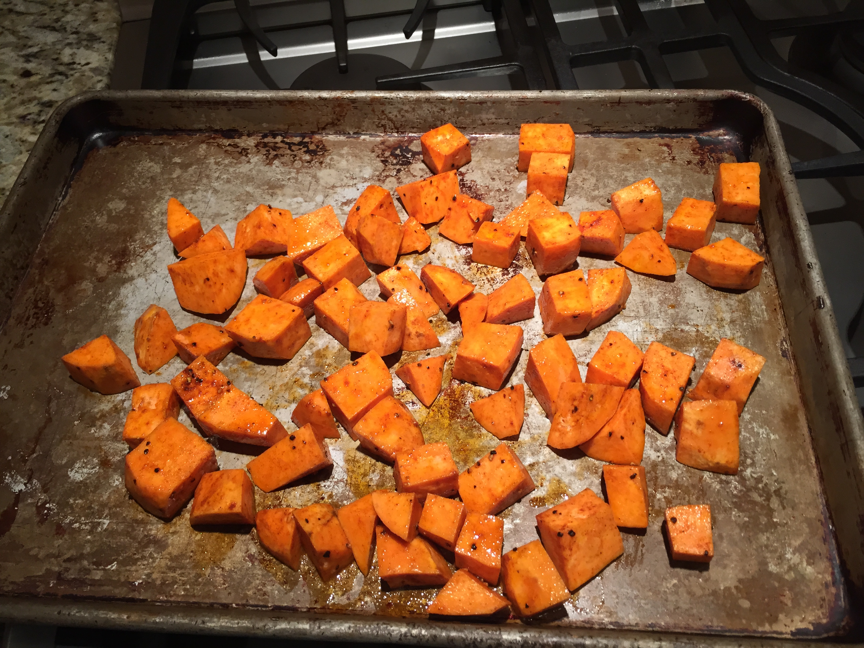Pour the sweet potatoes on a baking sheet.