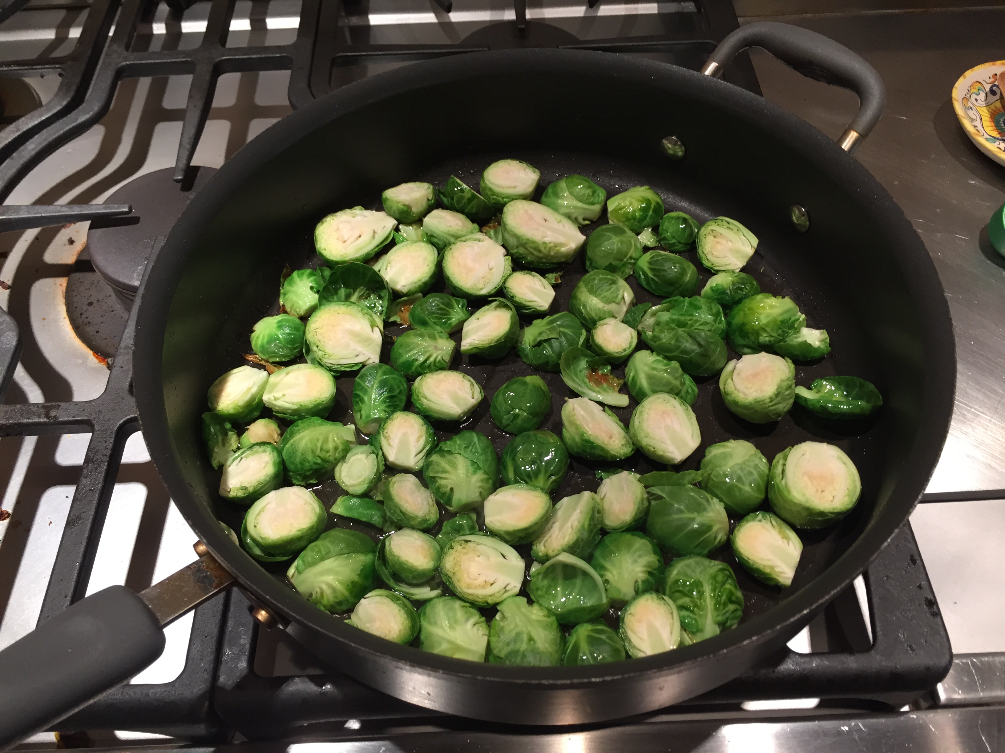 Clean the brussel sprouts by rinsing and then trimming off the ends and peeling the outer layer of the sprout off. Cut each one in half. Heat the oil in a large skillet over medium high heat. Once heated, add the halved brussels sprouts to the pan and saute for about 7-8 minutes on each side until the outer part is a caramelized brown and the inside is soft and fully cooked.