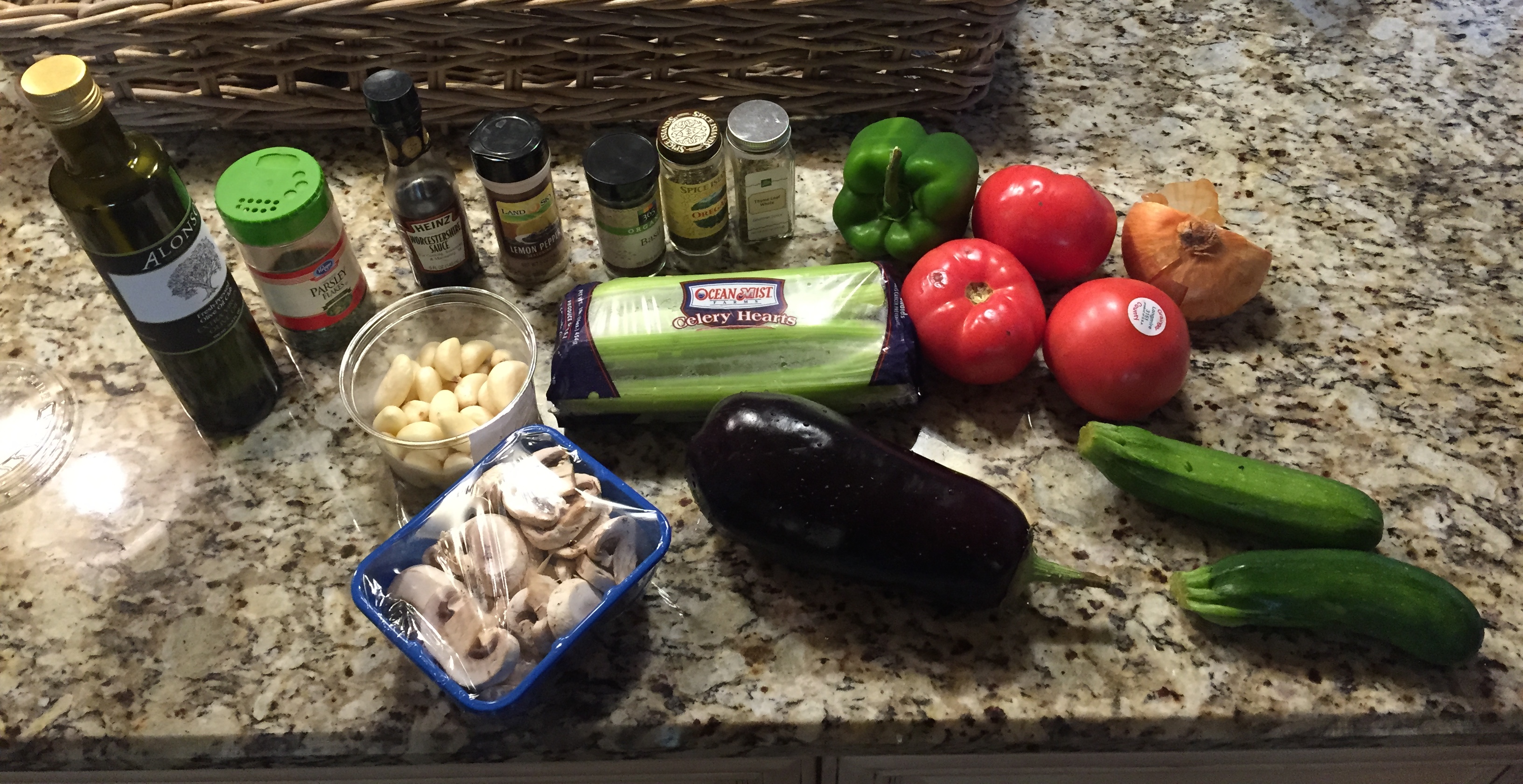 Add zucchini, green pepper, celery, onion and tomatoes. Saute for 5 minutes. Then add mushrooms and eggplant and stir to combine. Add worcestershire.