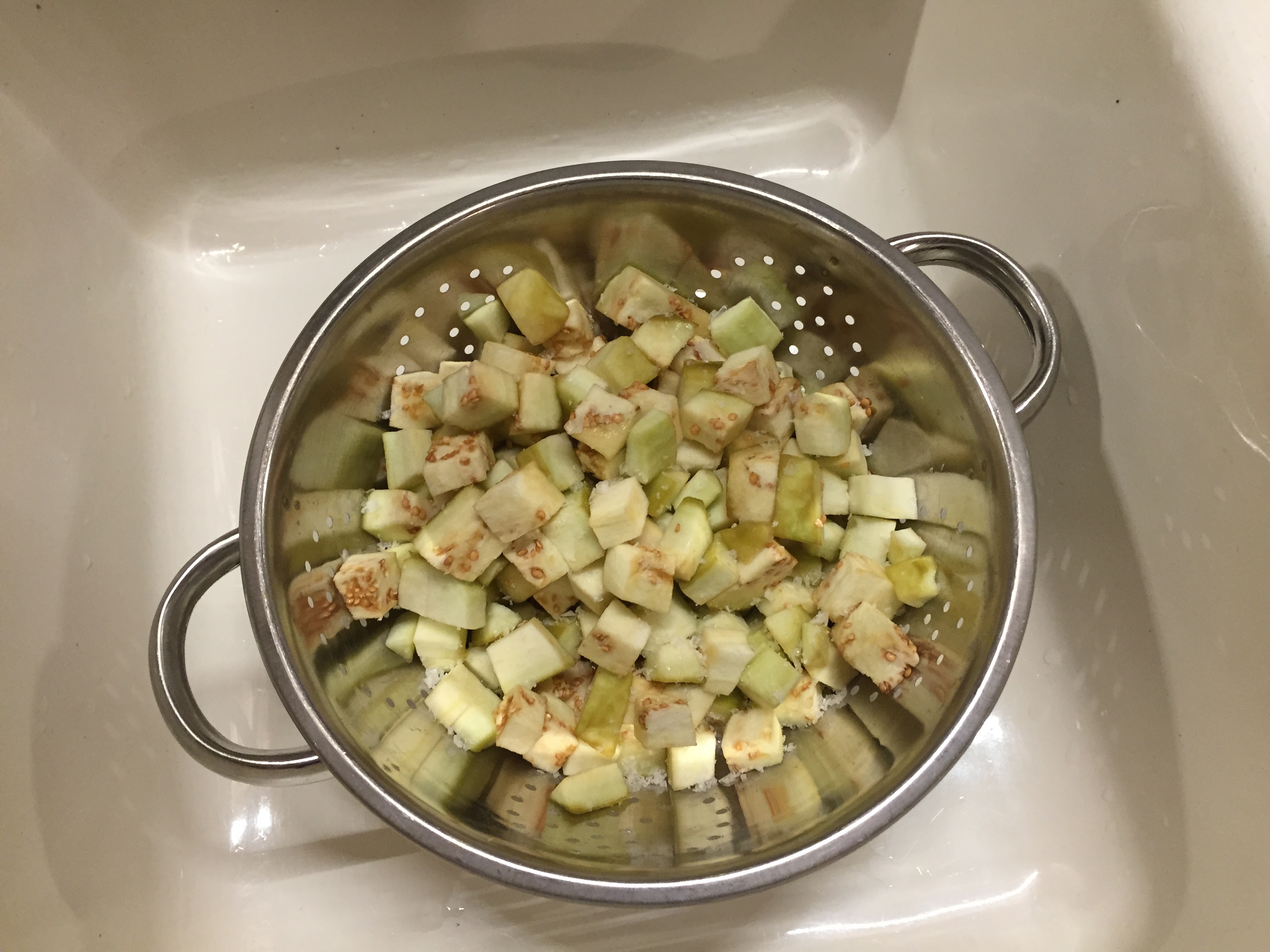 Peel eggplant and cut into 1/2 inch cubes. Place in a colander, and sprinkle with salt. Mix together and allow to drain.