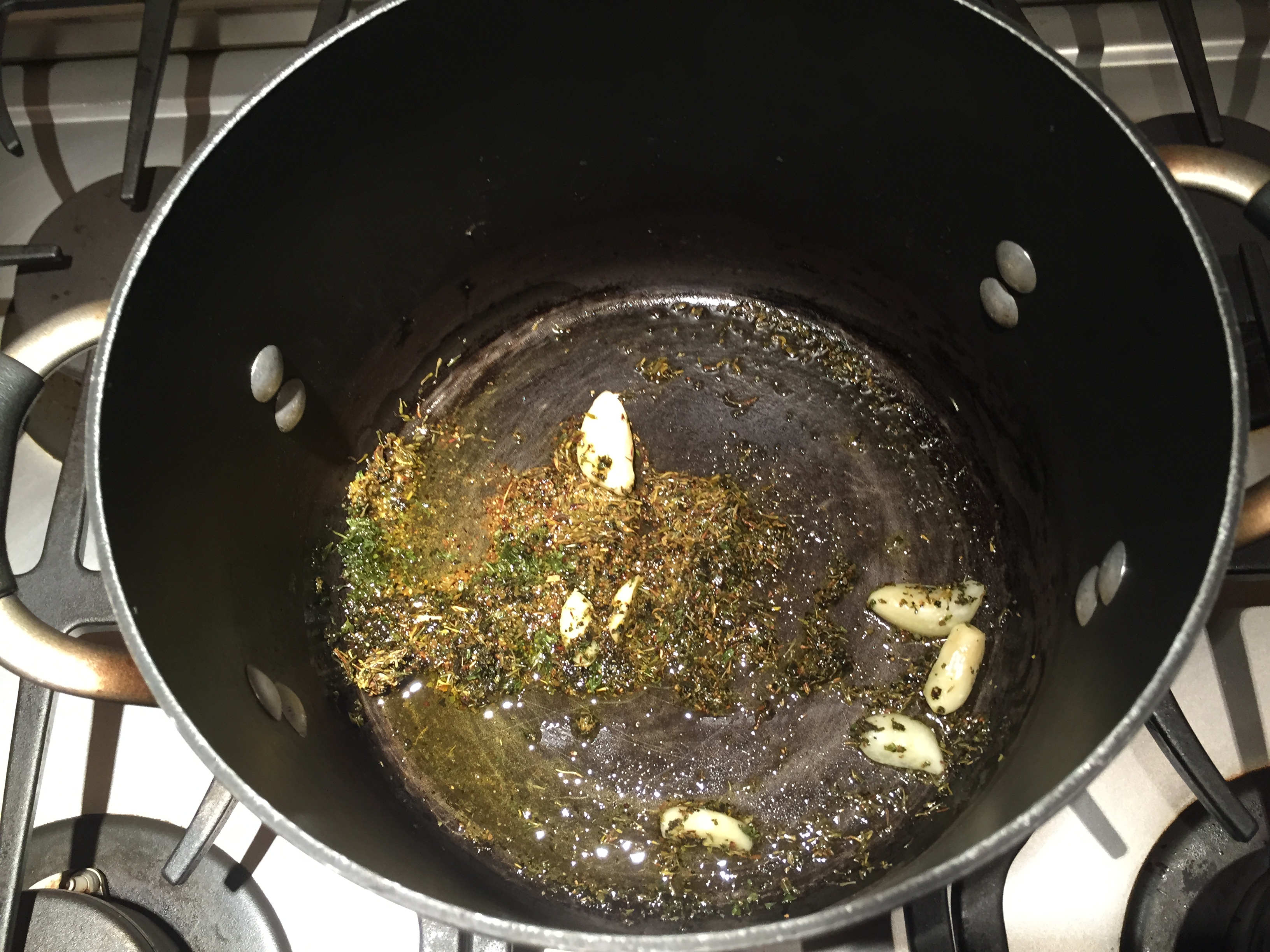 Then chop zucchini, mushrooms, green pepper, celery, onion and tomatoes into bite sized pieces. Chop garlic. In a 4 quart pot over medium heat, warm the oil. Add dried herbs and garlic and cook until fragrant.