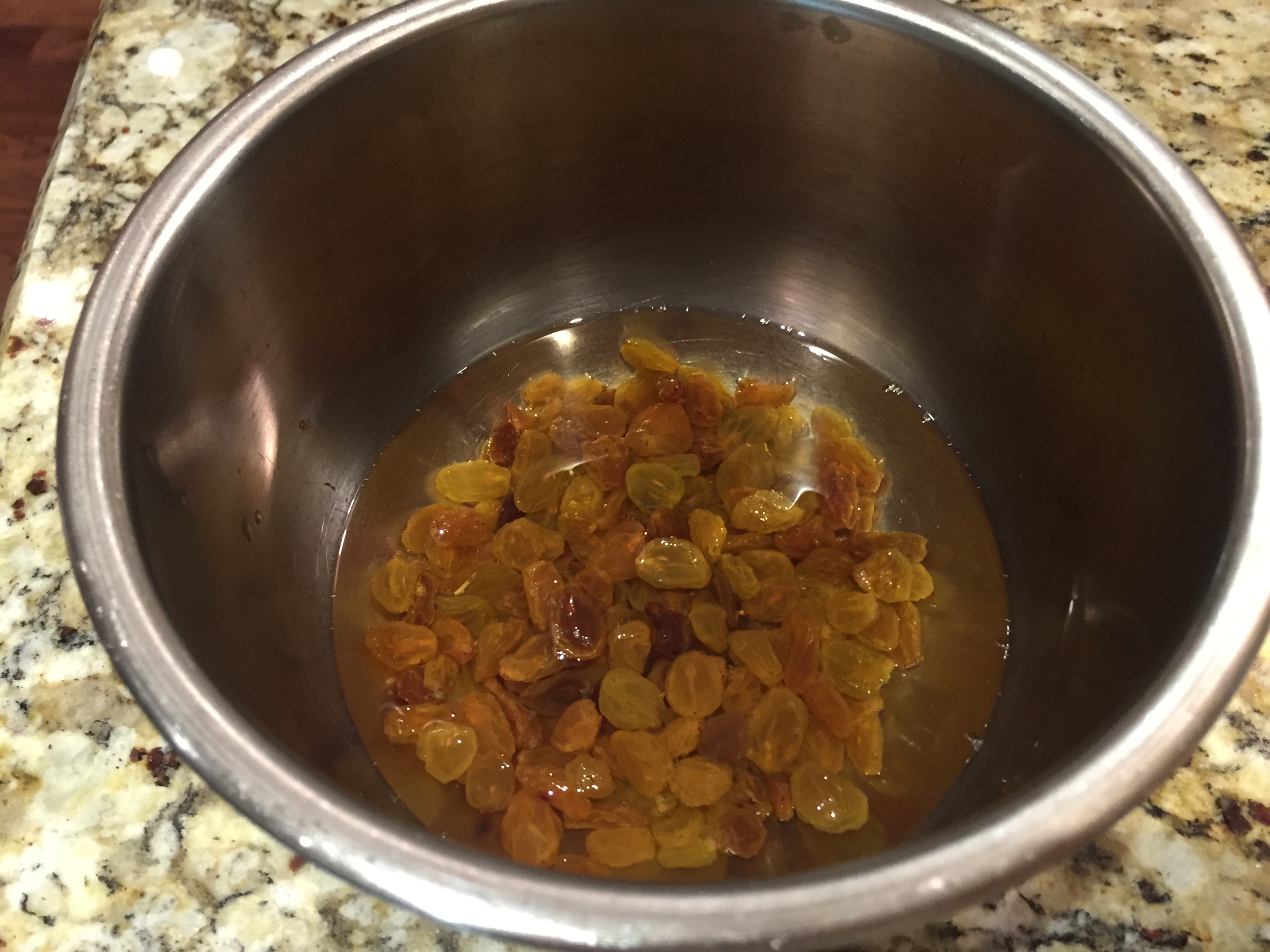 Meanwhile, plump the raisins by soaking them in the wine for 30 minutes; drain.