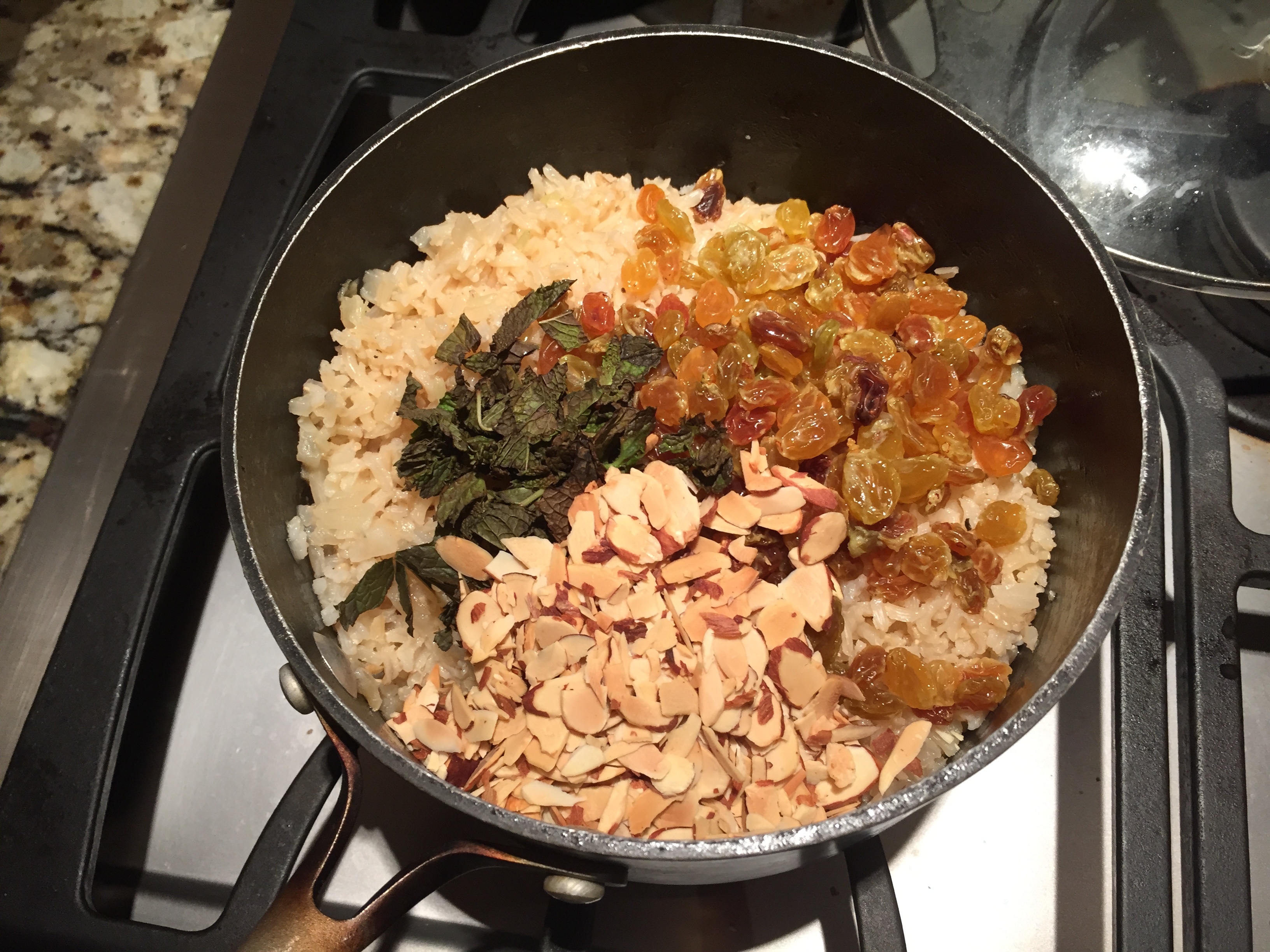 Remove rice from heat, and stir in raisins, butter, almonds and mint.