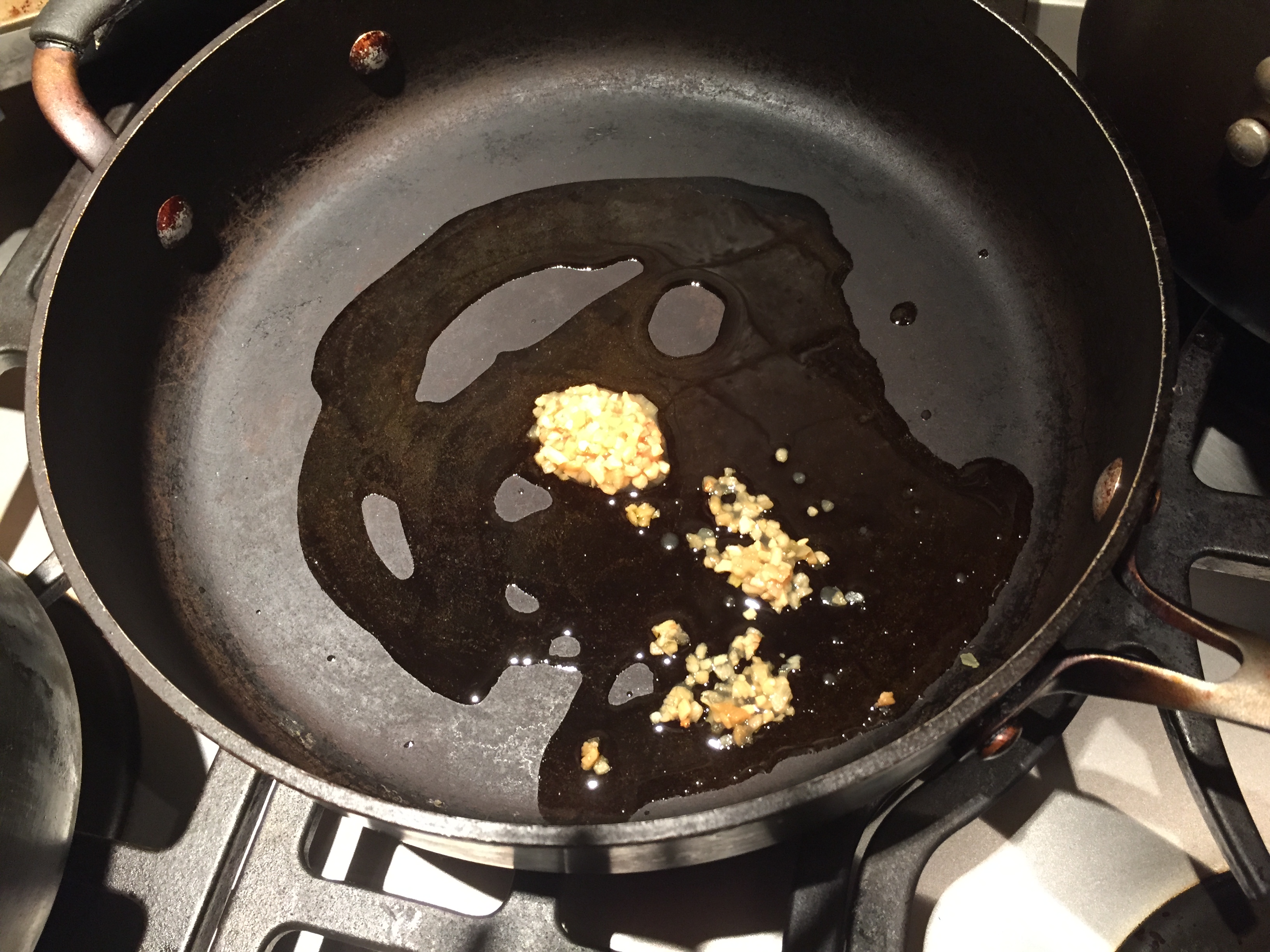 In a pan over medium heat, sauté the garlic in the oil for about a minute.