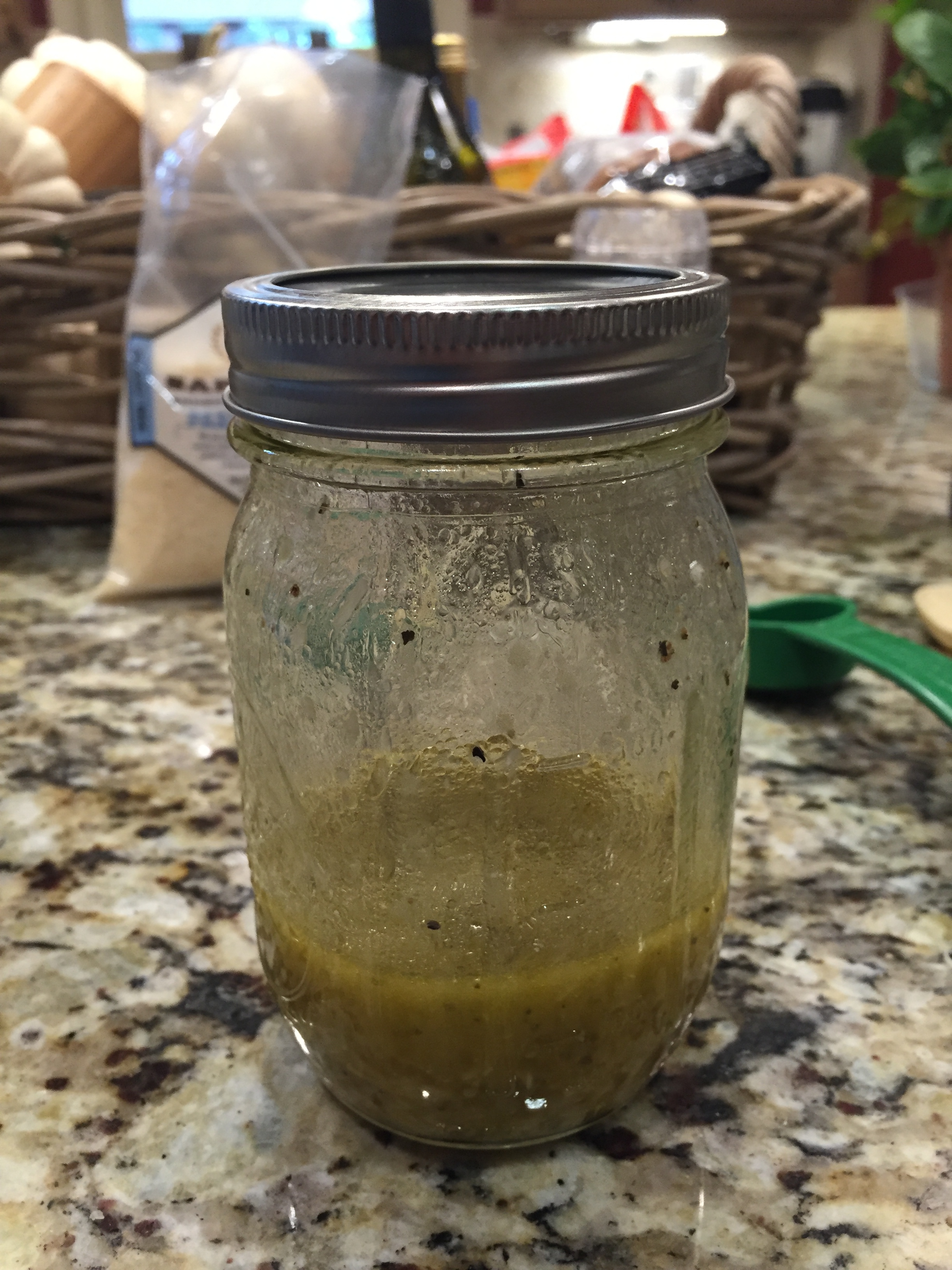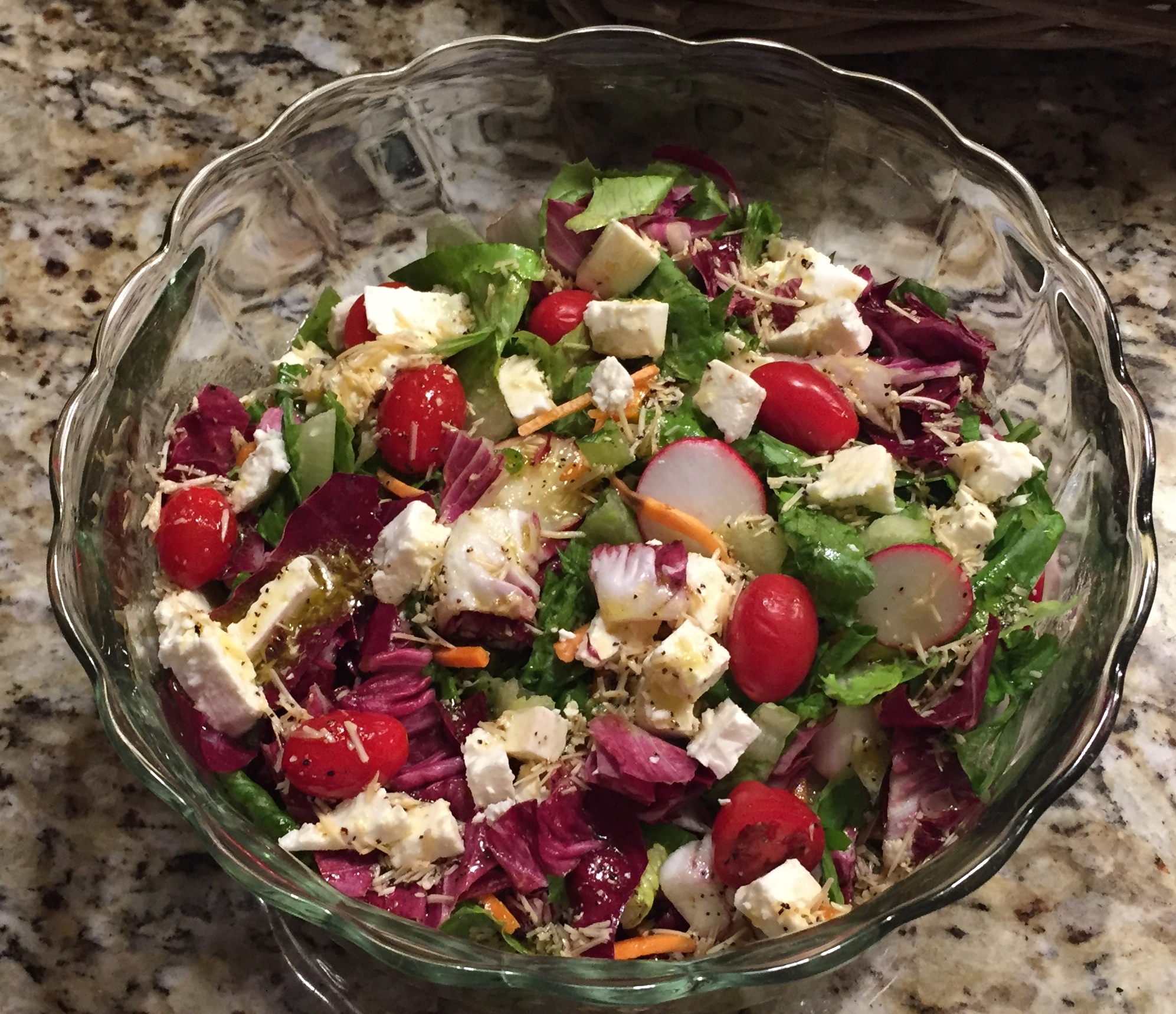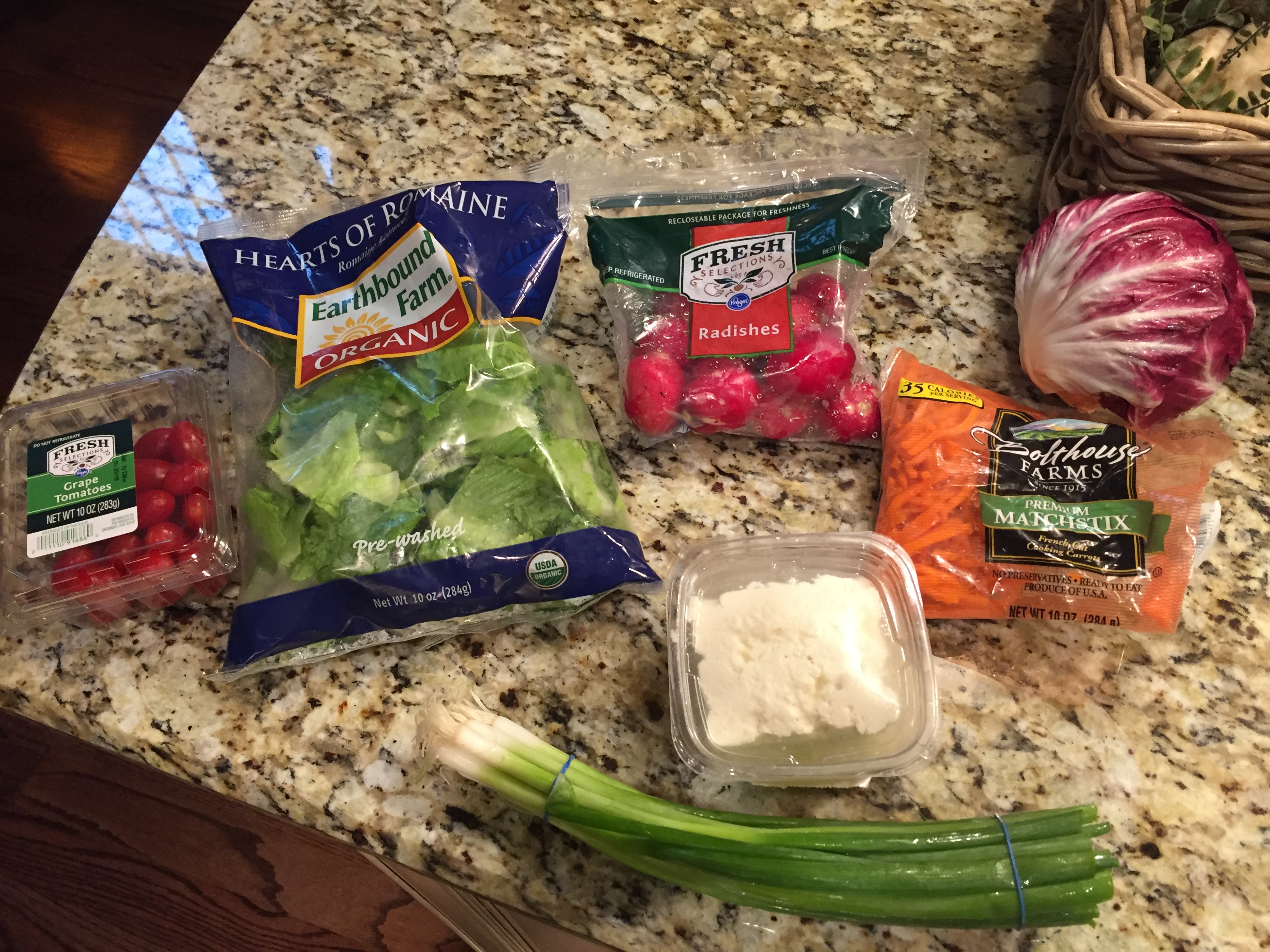 Drizzle over salad (I’m doing a mixed salad with the following: chopped romaine, scallions, grape tomatoes, carrots, radishes and crumbled feta) and serve.