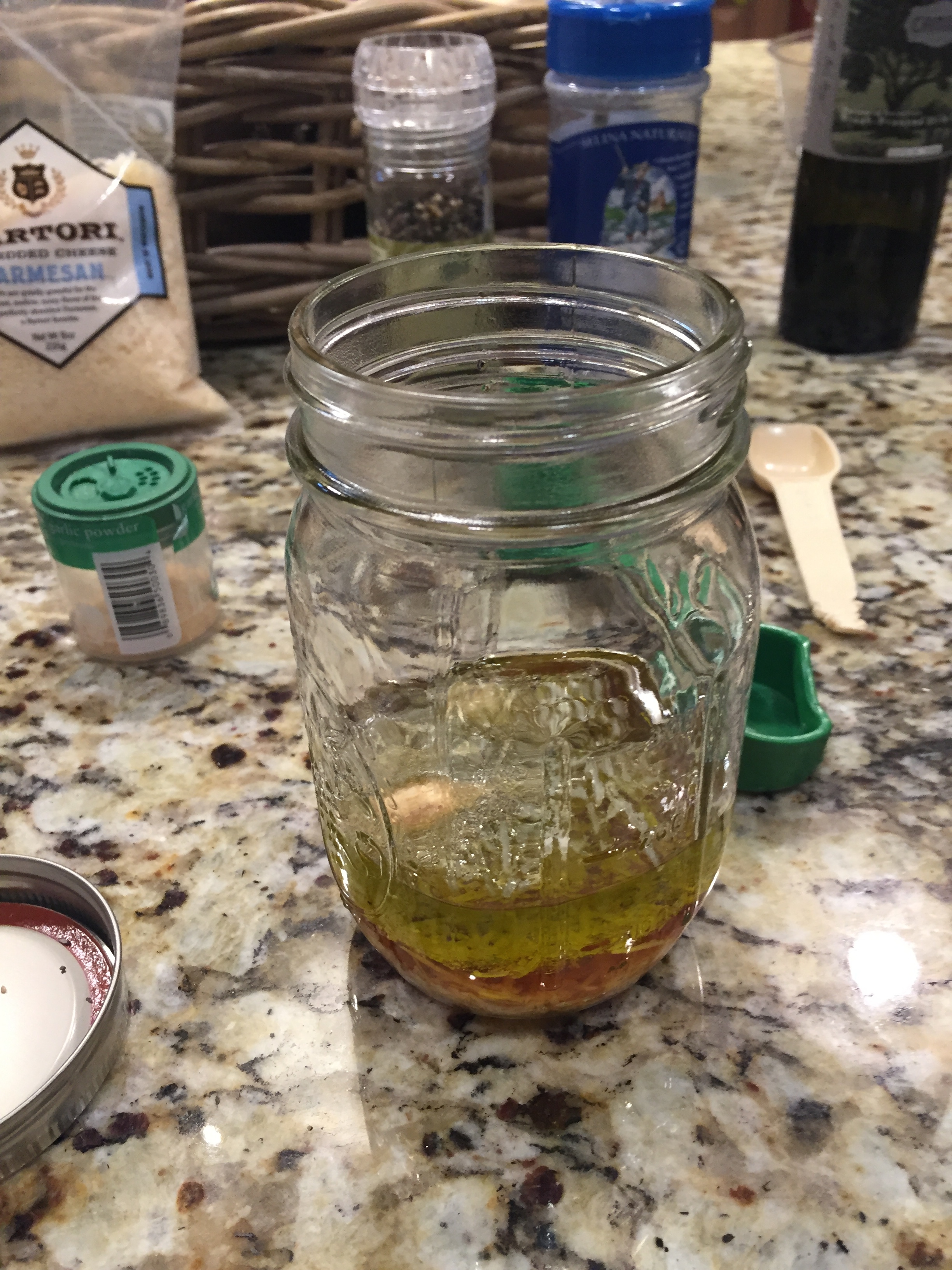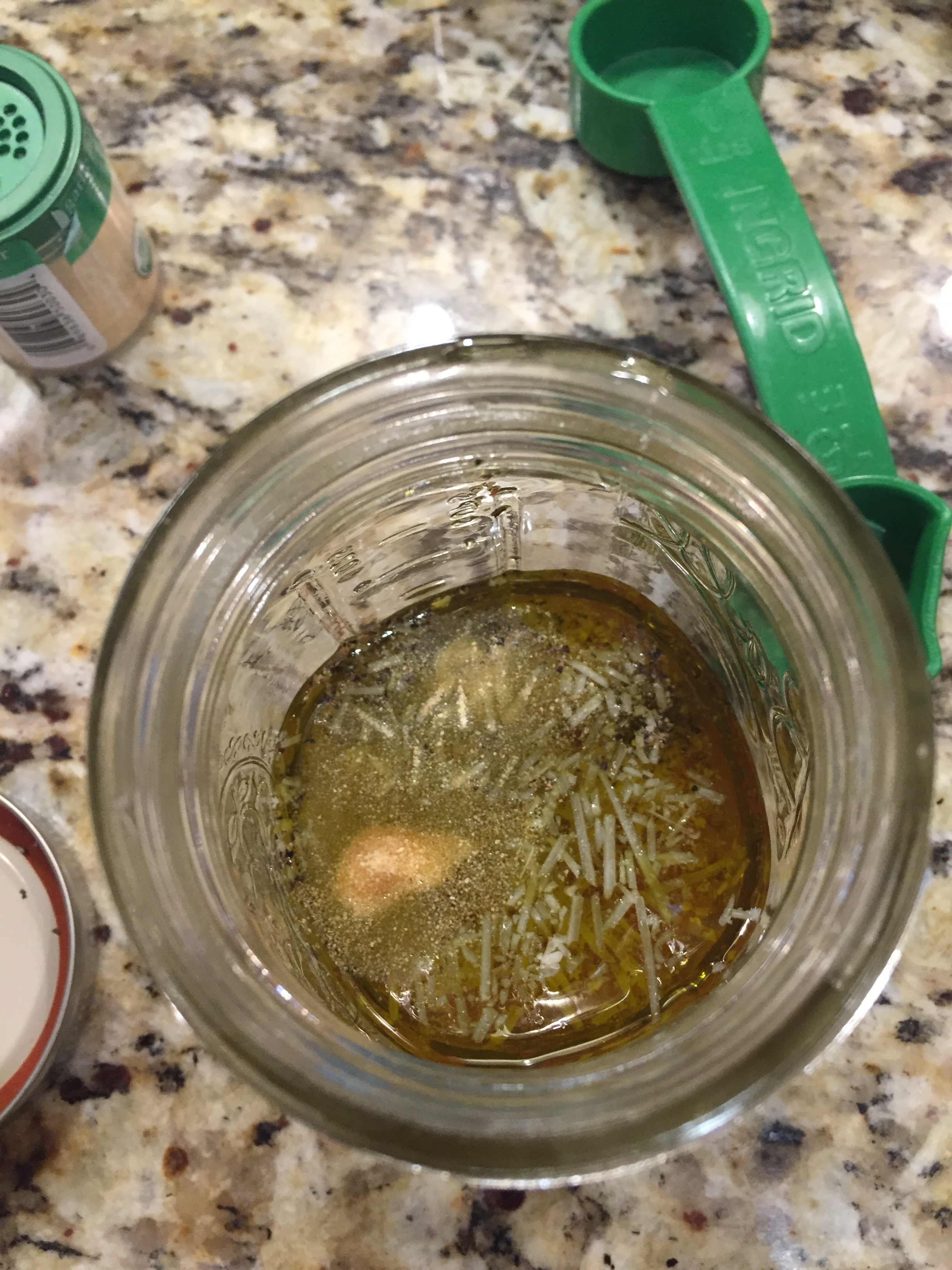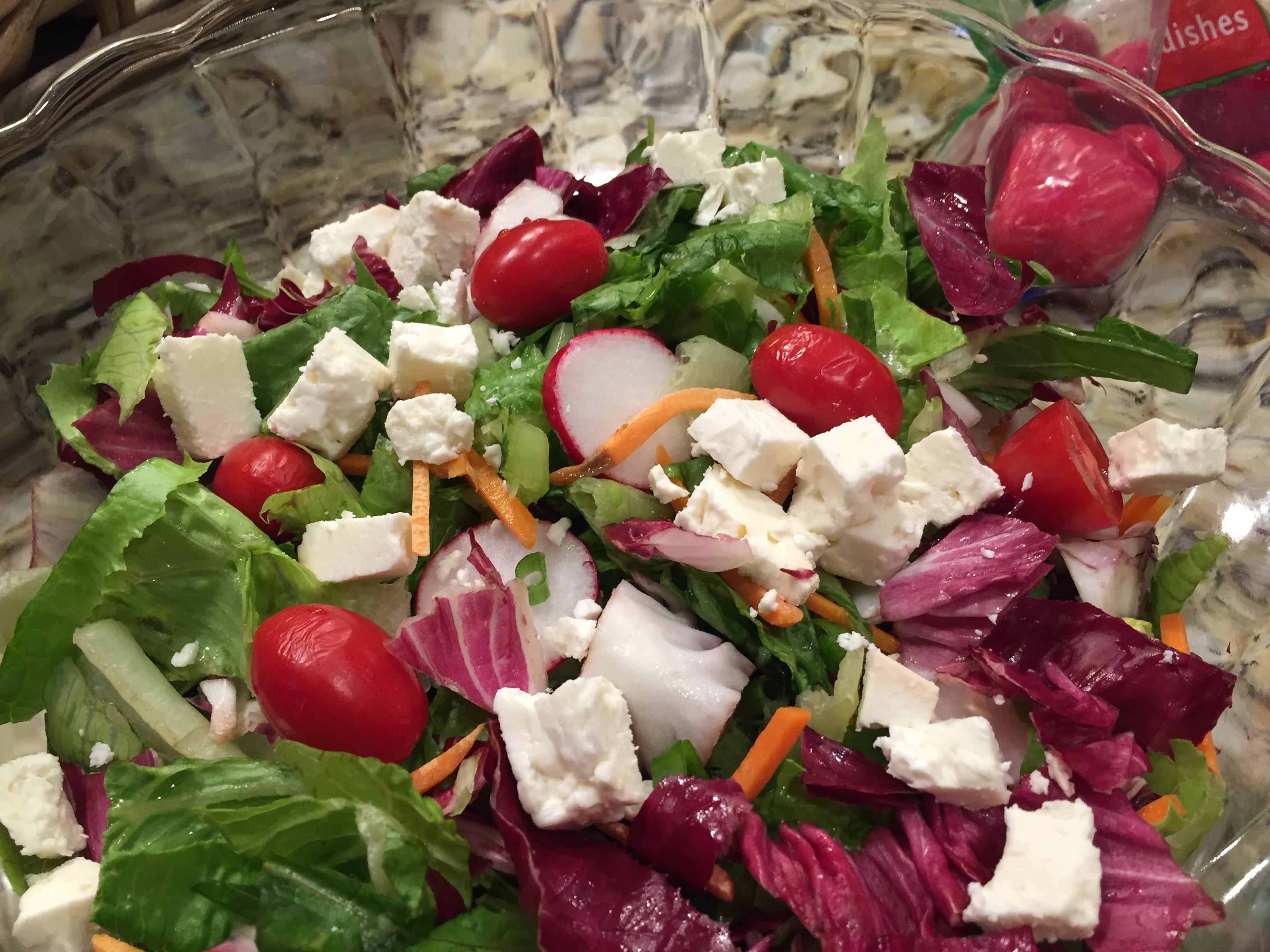 Drizzle over salad (I’m doing a mixed salad with the following: chopped romaine, scallions, grape tomatoes, carrots, radishes and crumbled feta) and serve.