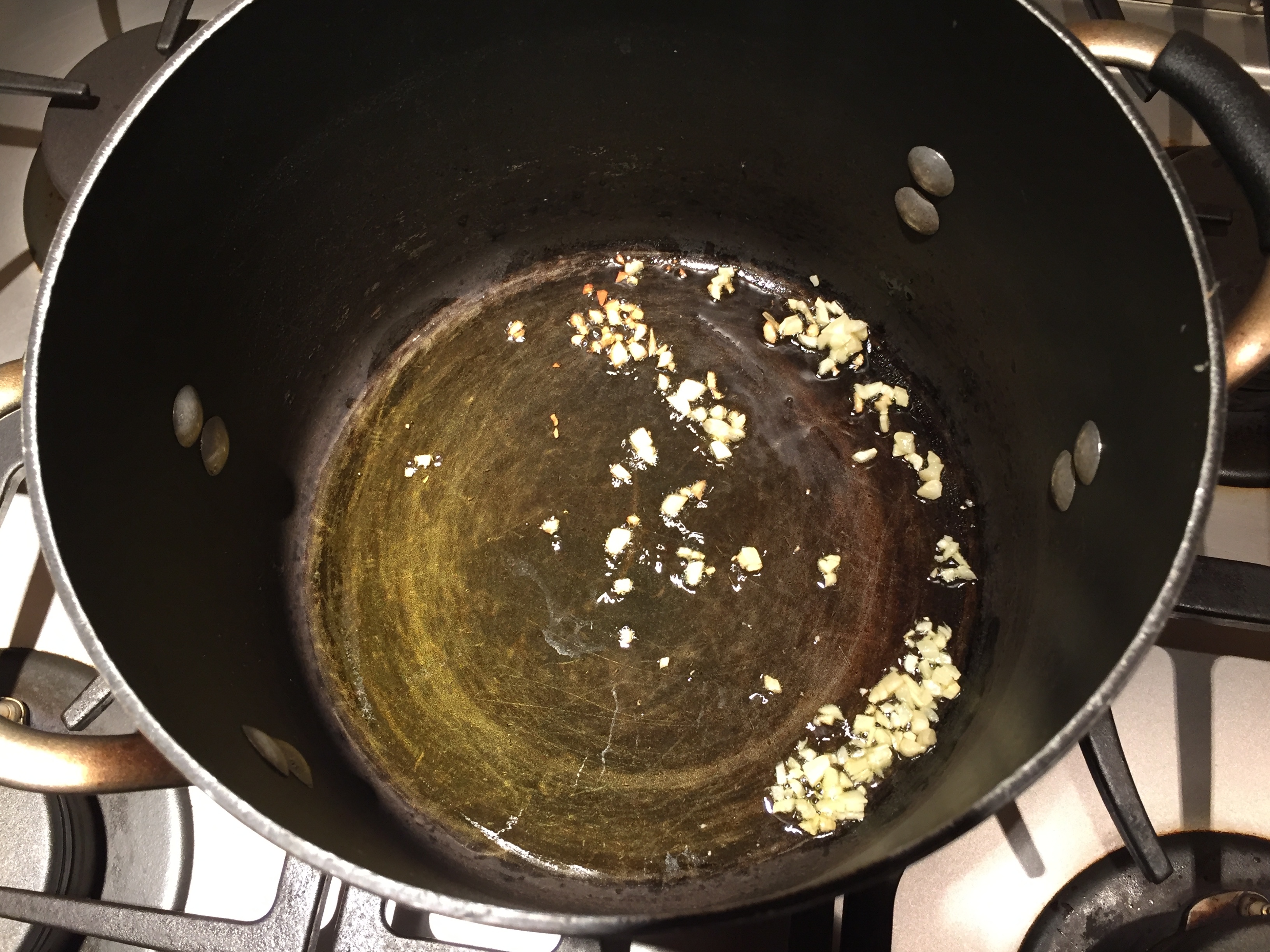 In a large saucepan over medium heat, add the oil, and heat until simmering (1 to 2 minutes). Add the chopped garlic to the pot. Cook, stirring, until light golden brown, about 1 minute.
