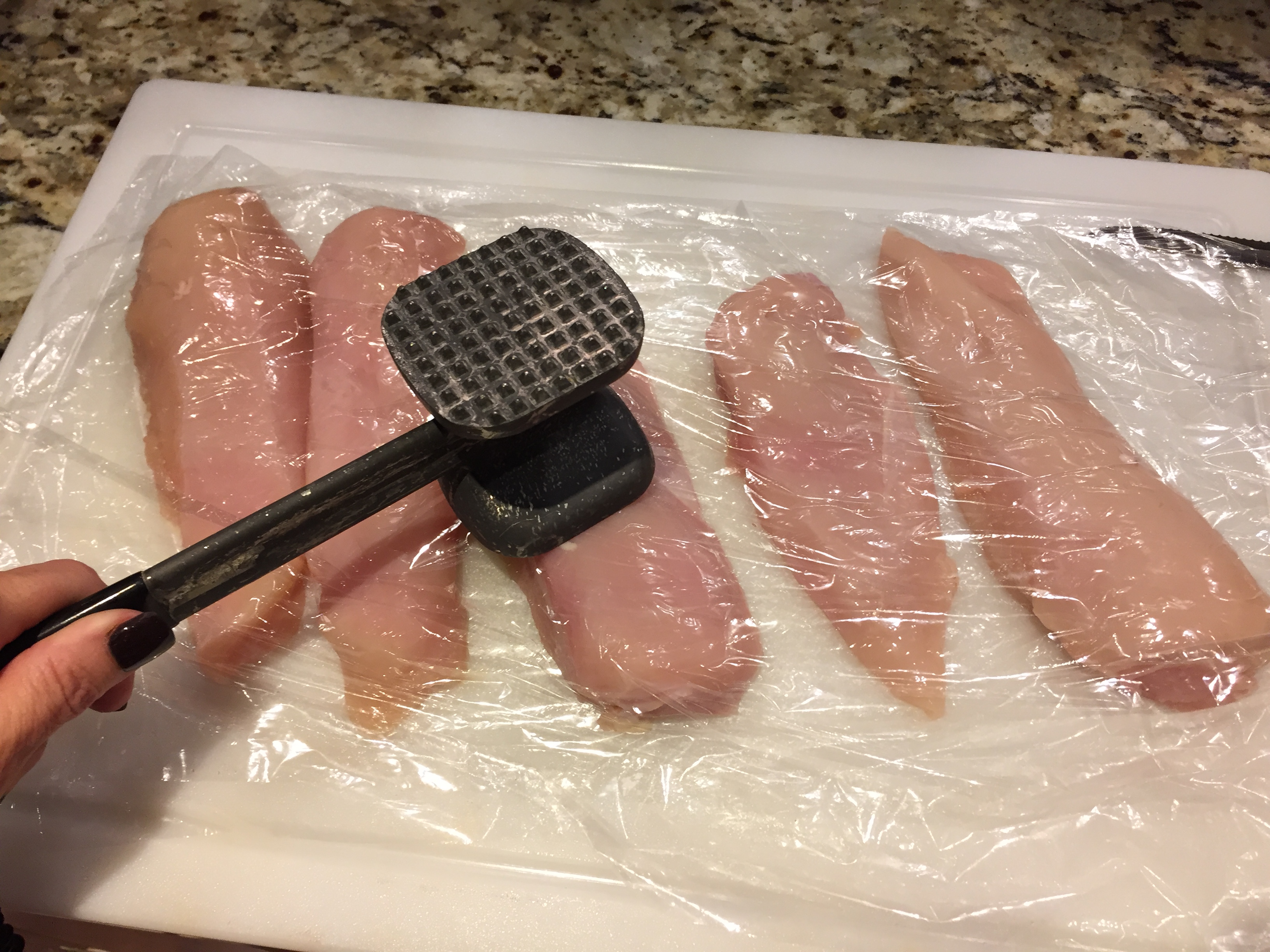 Place the chicken breasts on a cutting board, and cover with wax paper or plastic wrap. Using a meat pounder or a rolling pin, pound to an even 1/4-inch thickness.