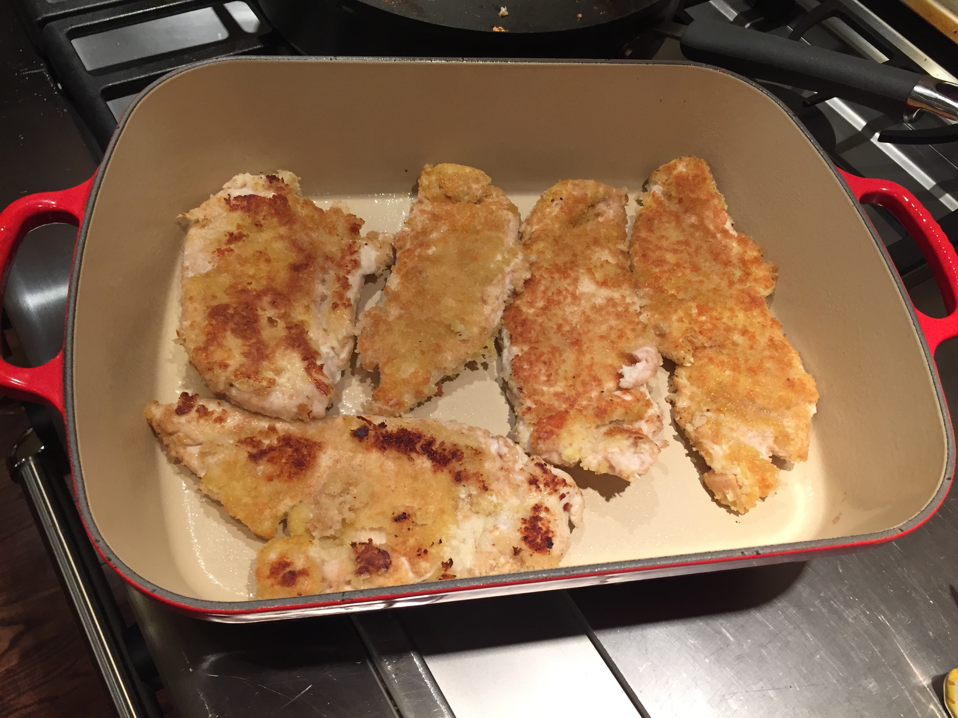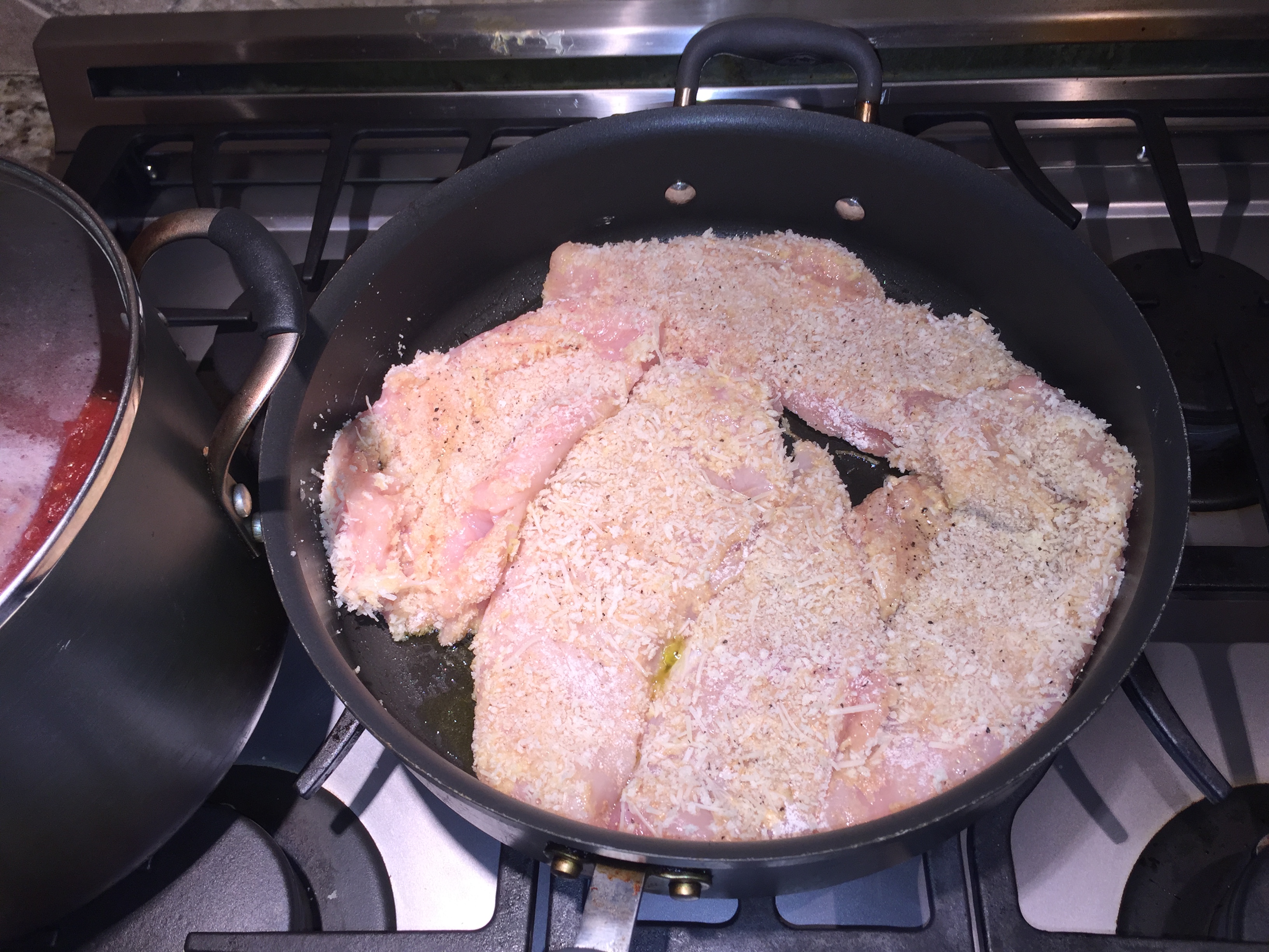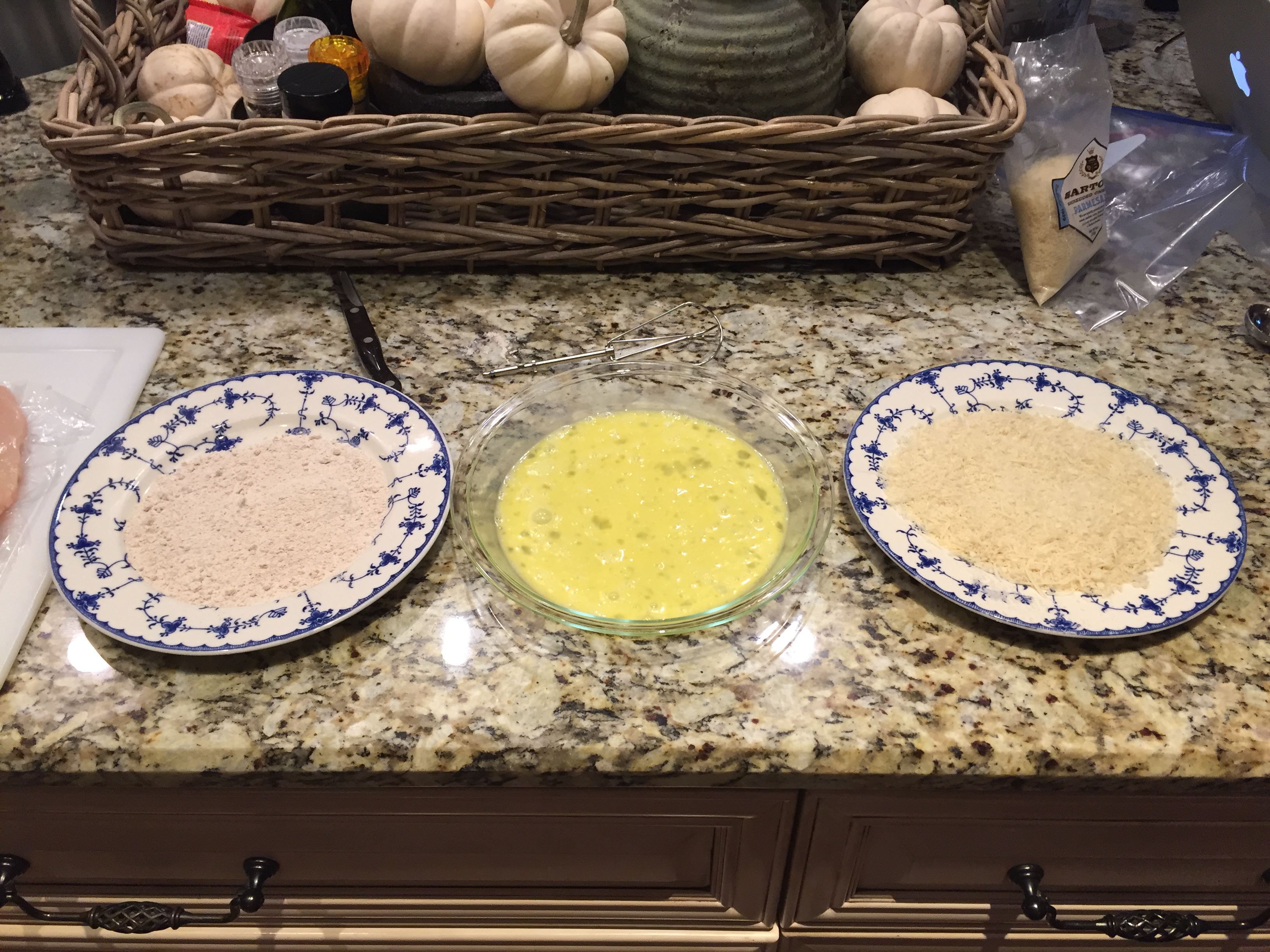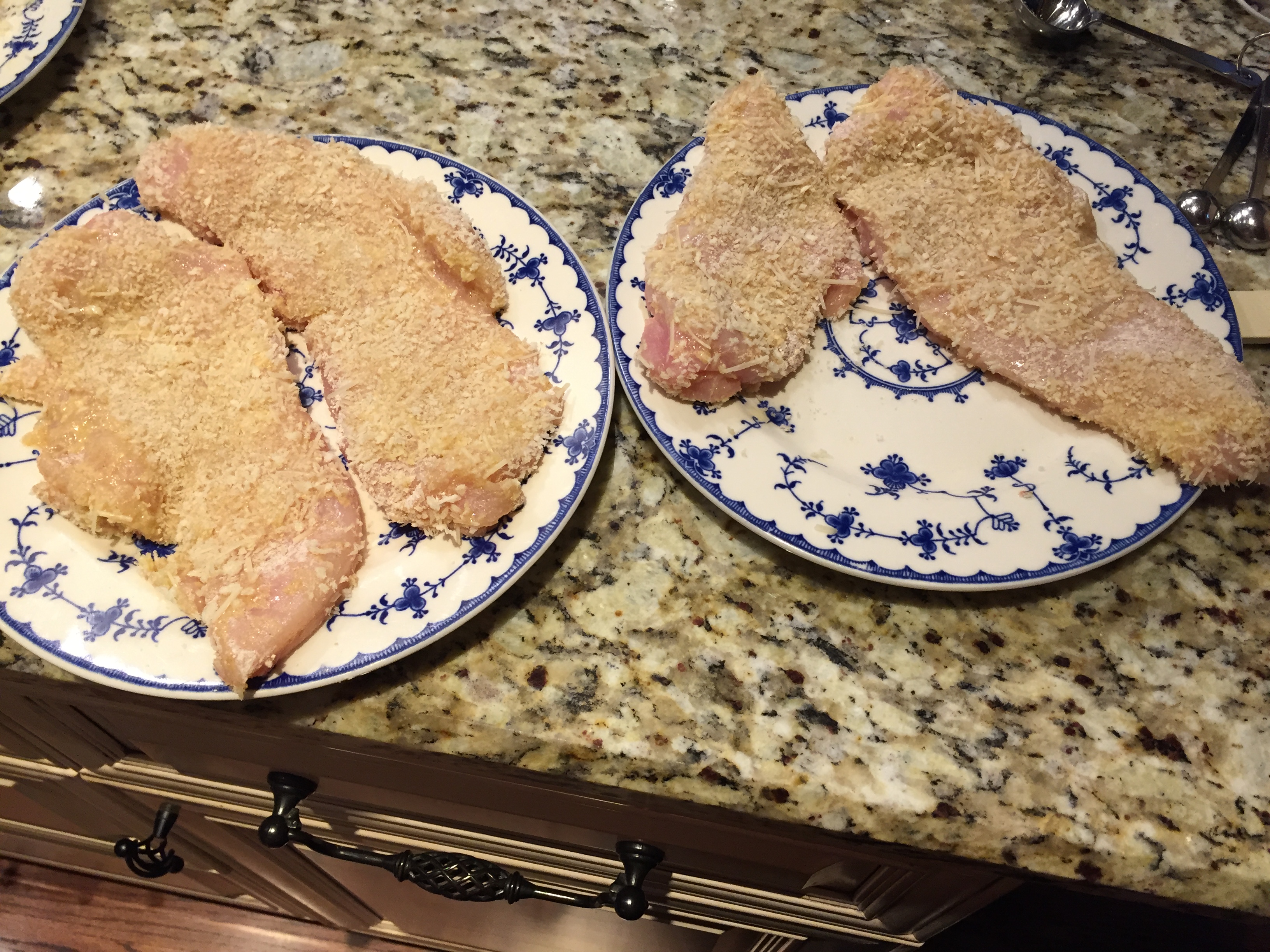 Place the flour in a plate. In a shallow bowl, beat the eggs with a fork. On a second plate, combine the bread crumbs, parmesan, 3/4 tsp salt and 1/4 tsp pepper. Add a clean plate nearby for the breaded chicken.