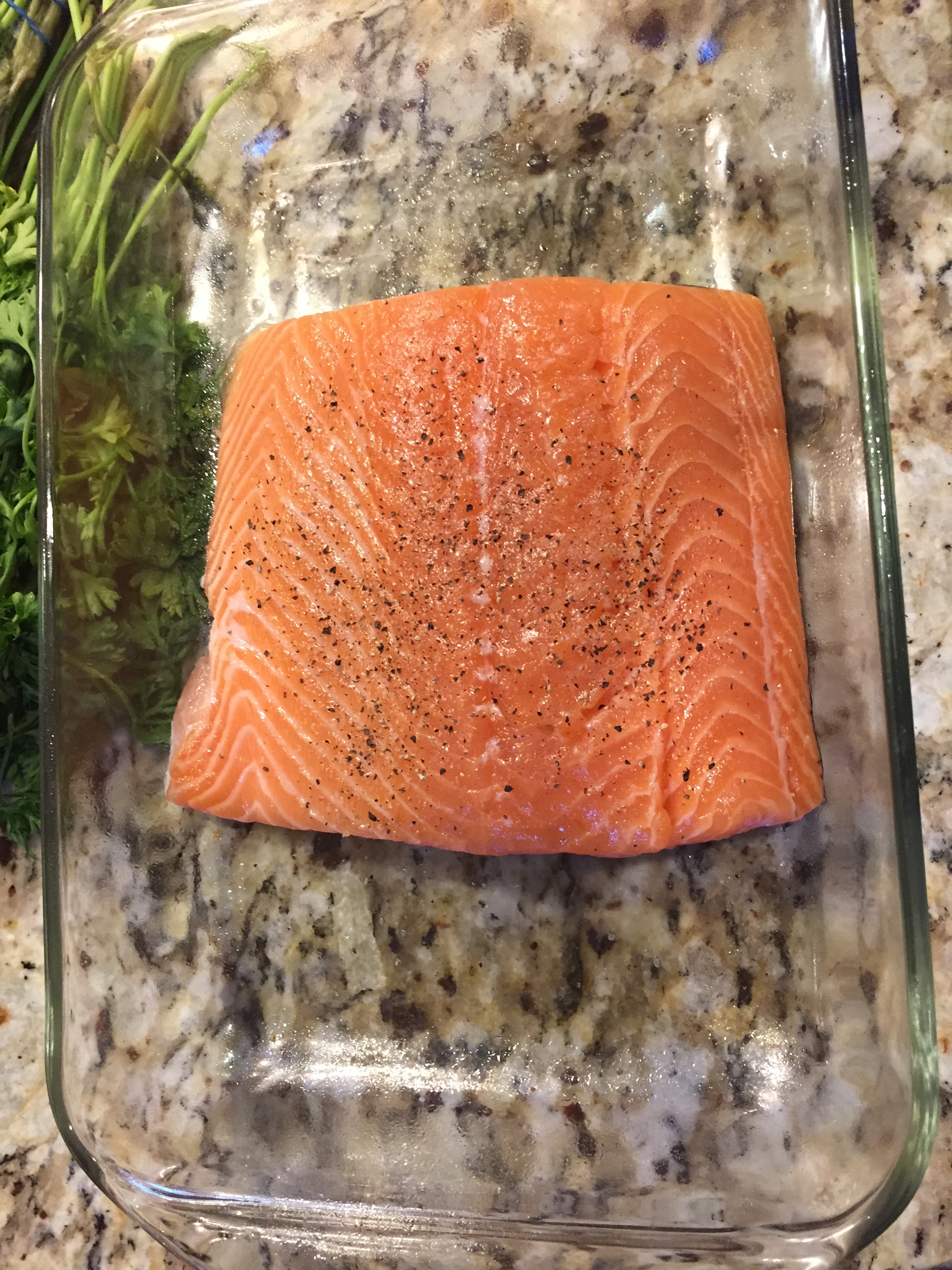 Preheat oven to 400 degress F. Place salmon fillets in a glass baking dish, and sprinkle with salt and pepper.