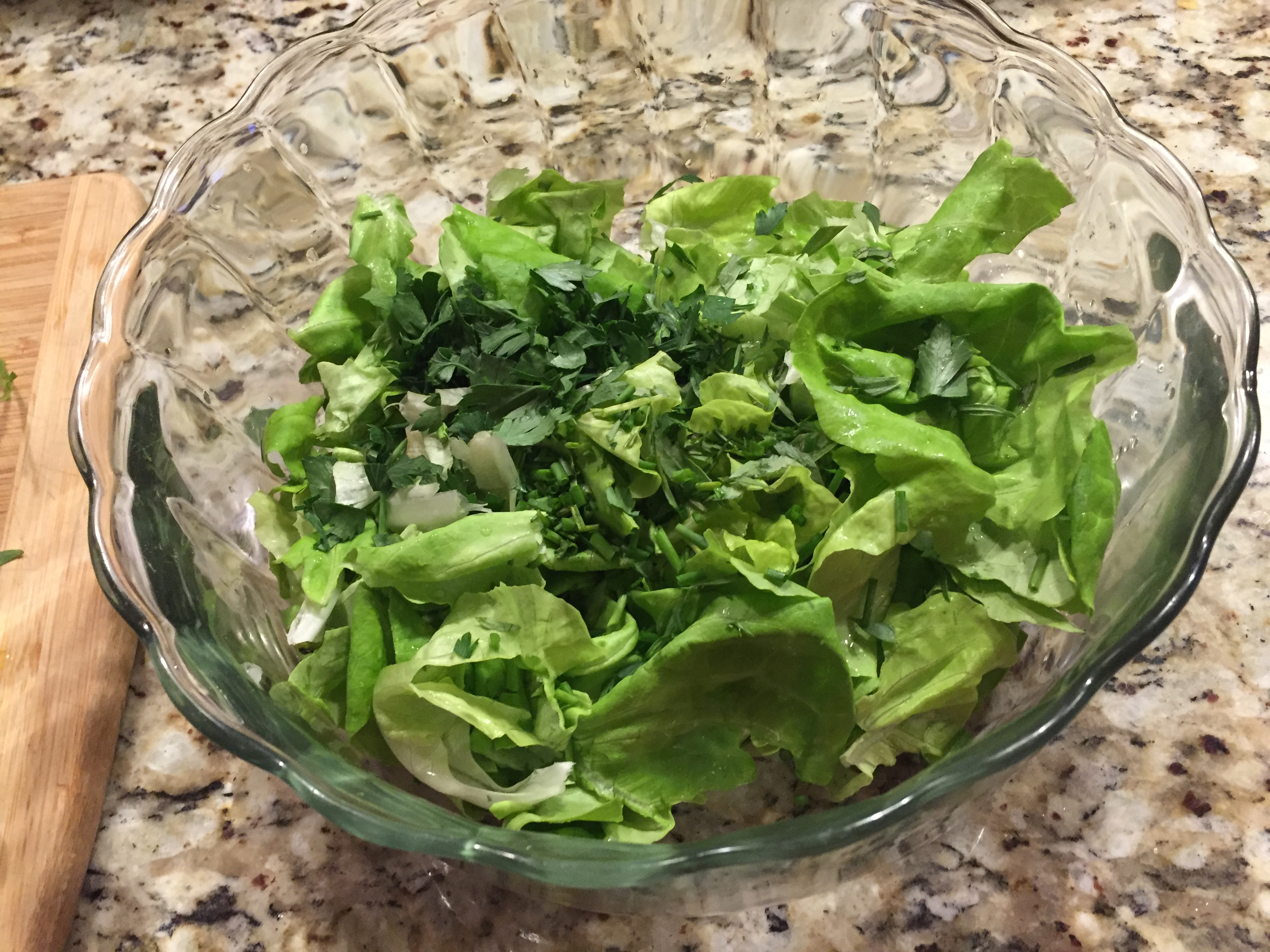 Toss the lettuce, chives, tarragon and parsley and then toss with the vinaigrette.