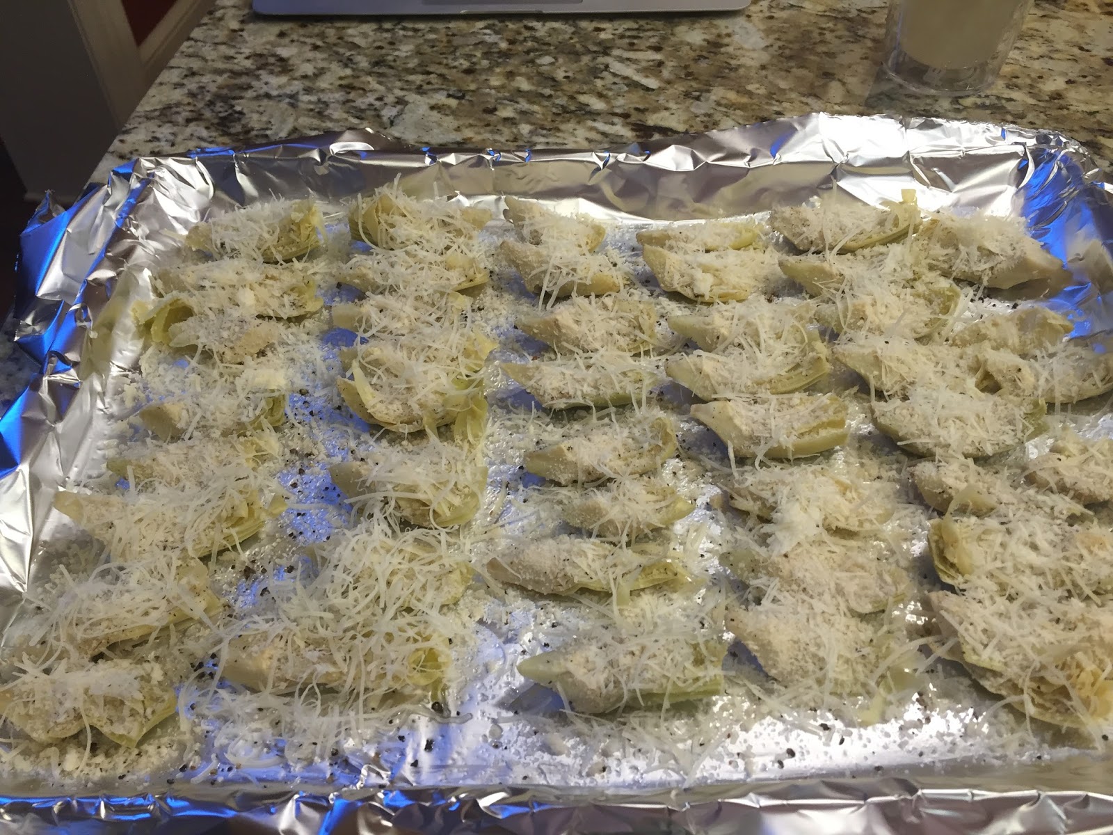 Sometimes recipes don’t have to be complex to be fabulous. This recipe could not get any easier! Simply arrange the artichoke hearts on a baking sheet, top with bread crumbs, evoo and cheese, and then broil. Simple and delicious. For my dinner party of 12, I’ll be doubling or tripling this recipe.