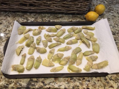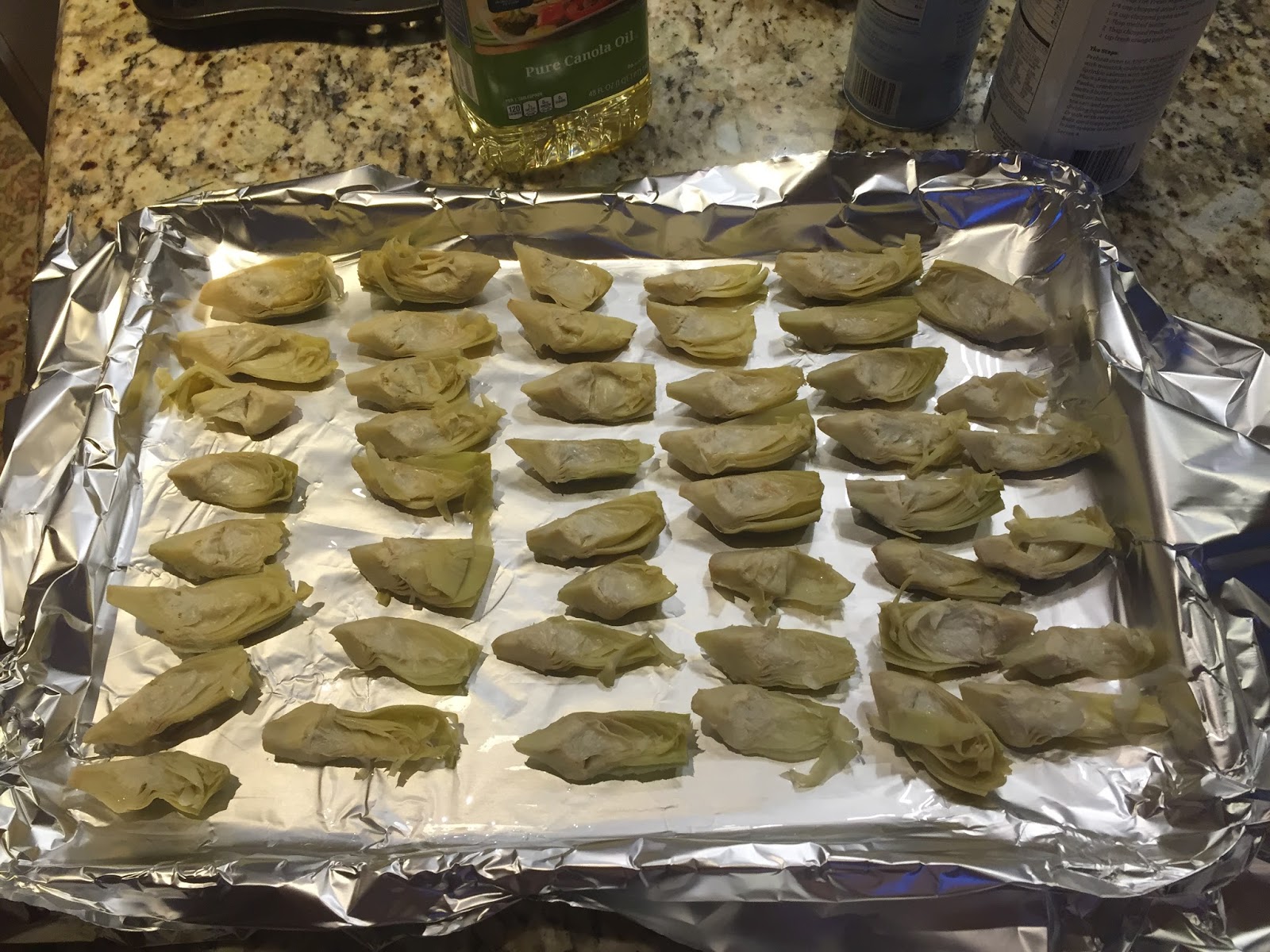 Place artichoke heart halves on paper towels cut-side down to drain for about 15 minutes.