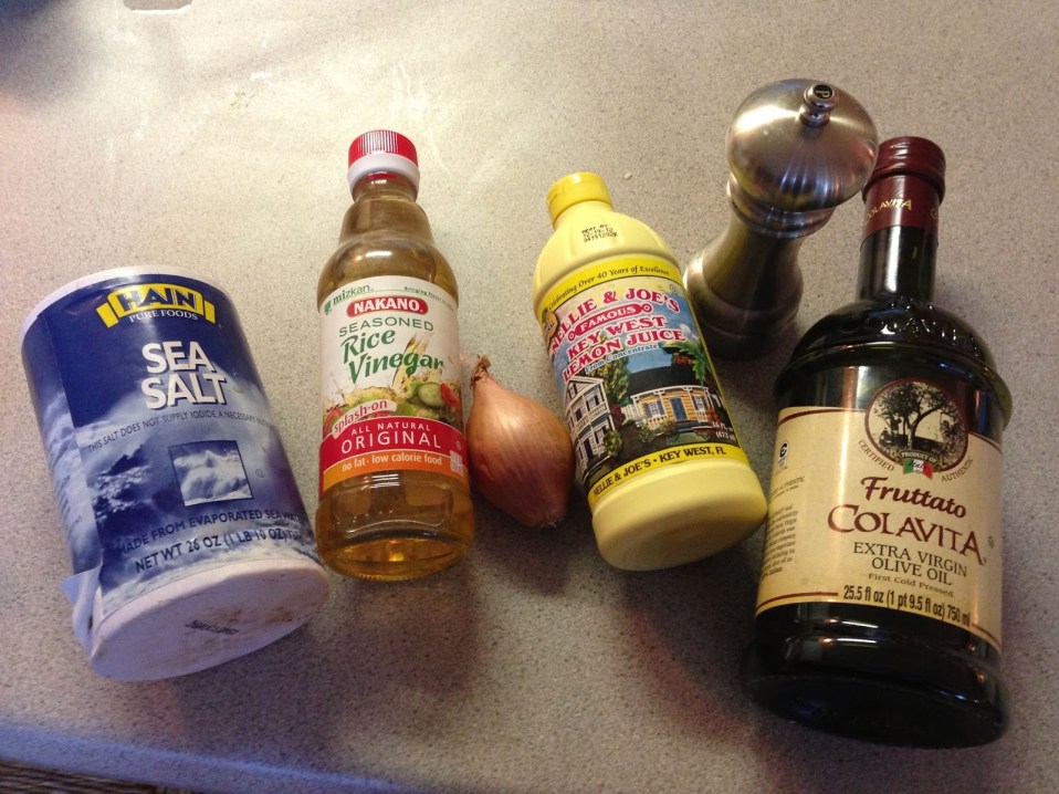 Combine 1 finely chopped shallot, 2 tablespoons fresh lemon juice (I use Nellie and Joe’s Lemon), and 1 tablespoon unseasoned rice vinegar in a jar or small bowl; season with kosher salt and freshly ground black pepper.